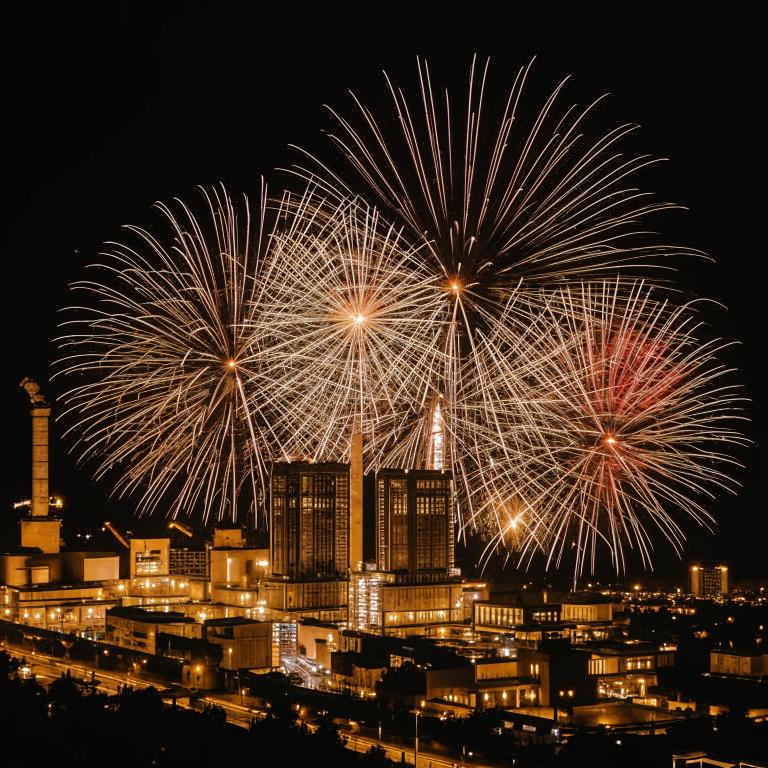 Каскады оранжево-золотых струй («жидкий металл») и силуэты шестерен из белых трассеров отражают ковку и обработку. Ритмичные взрывы усиливают динамику труда.