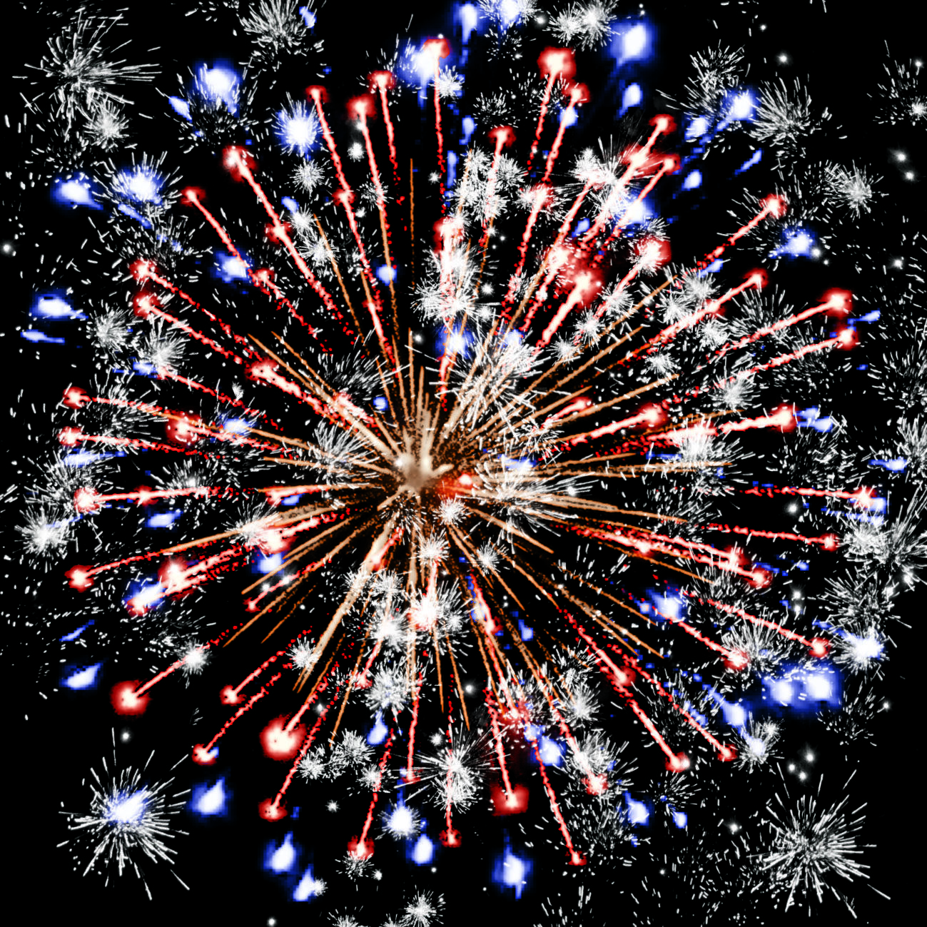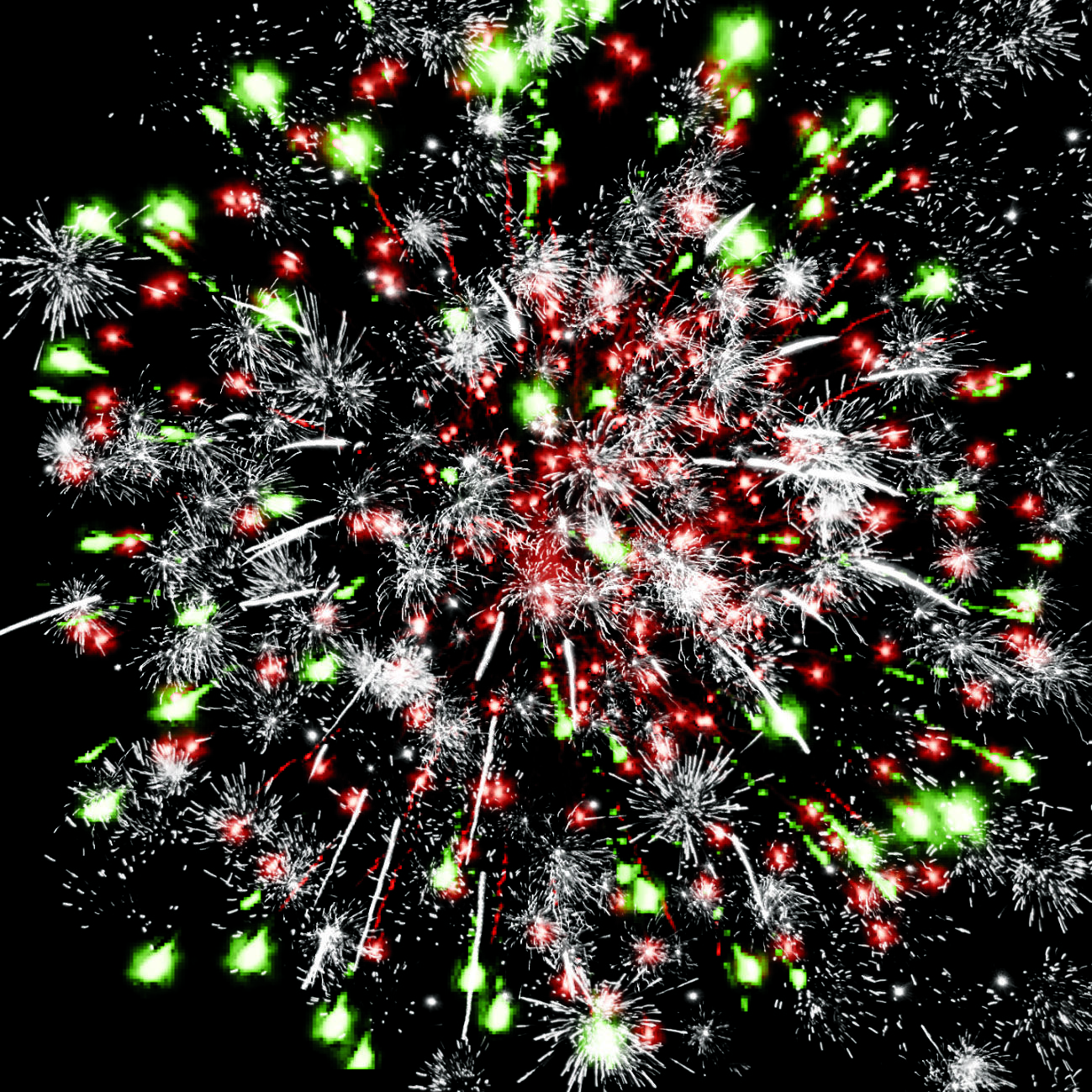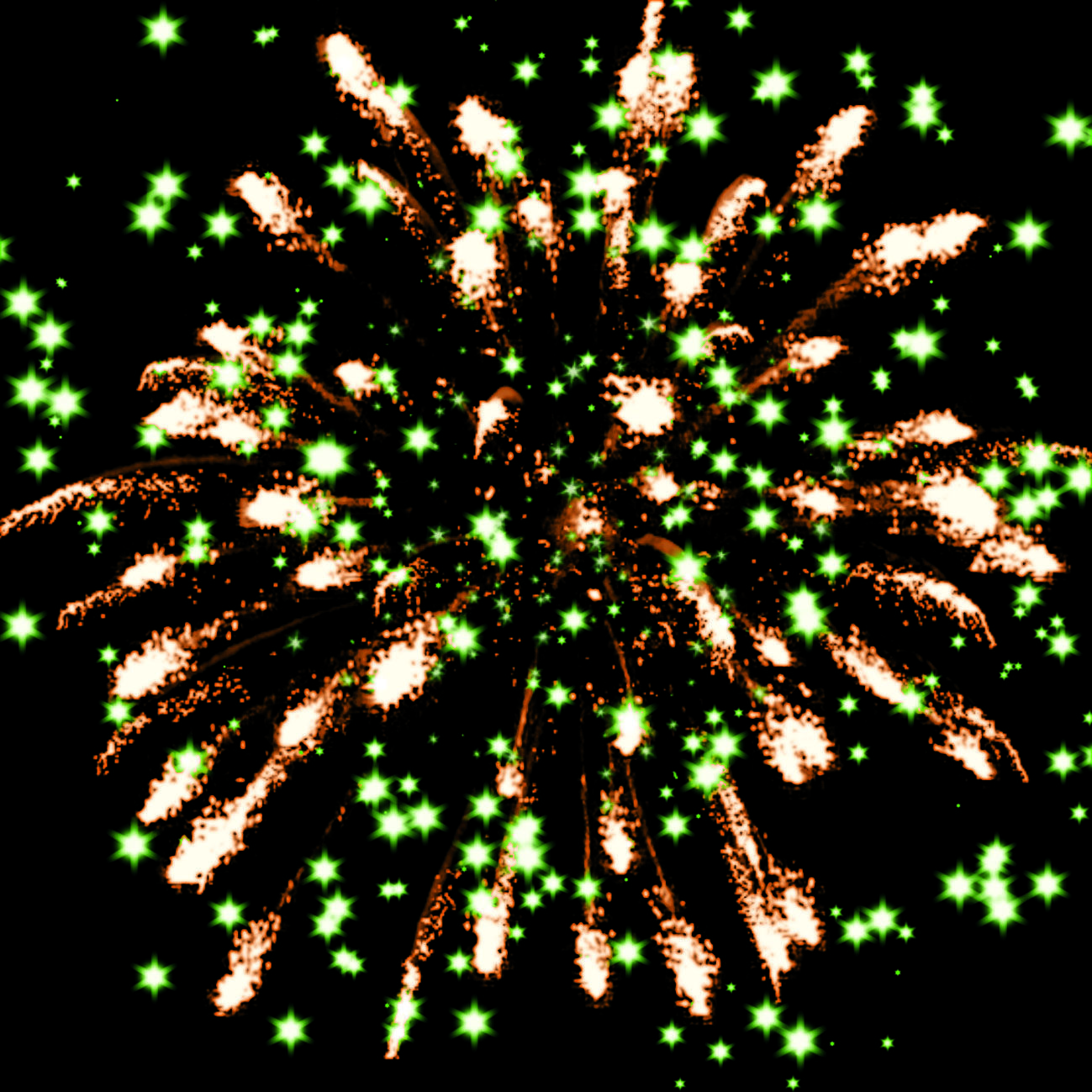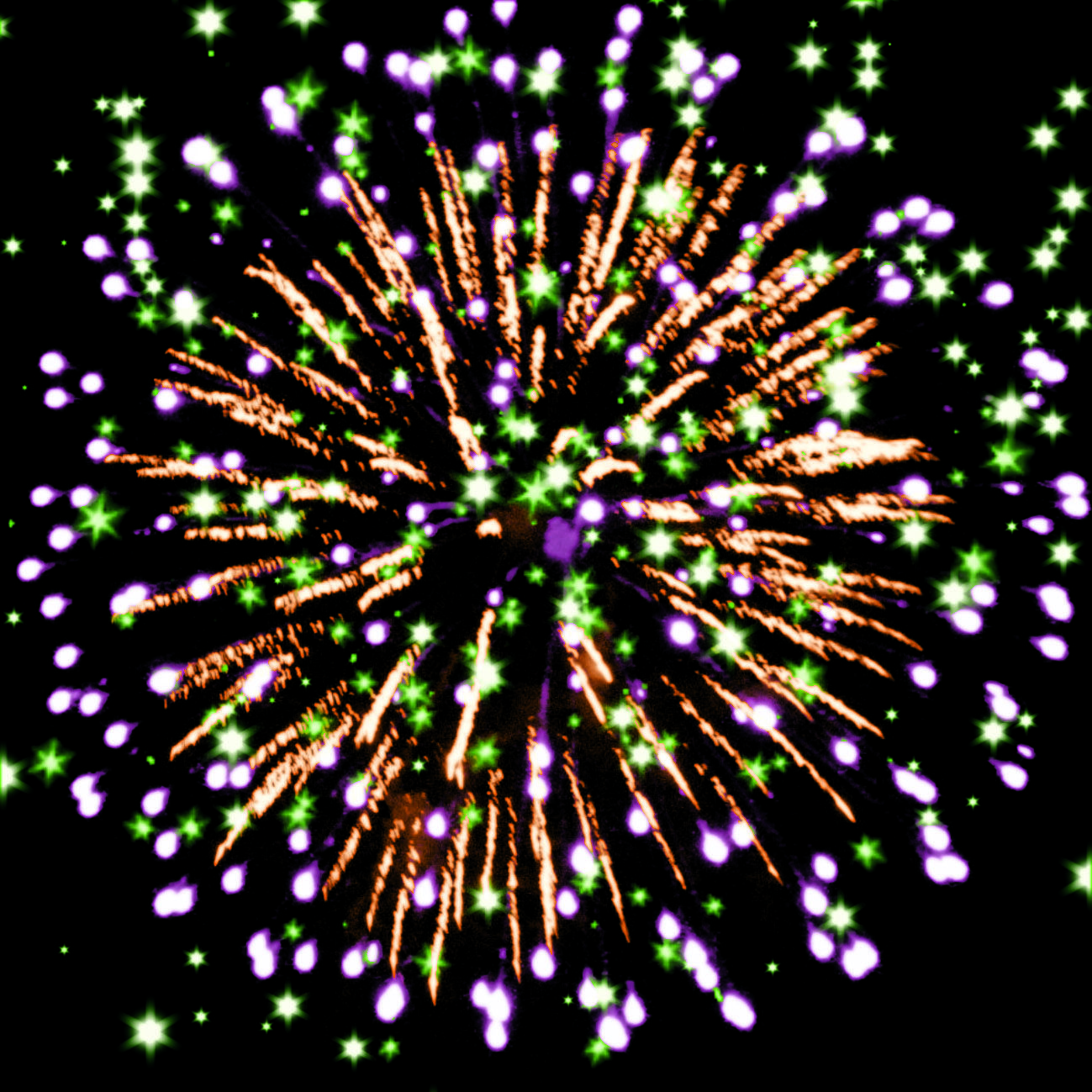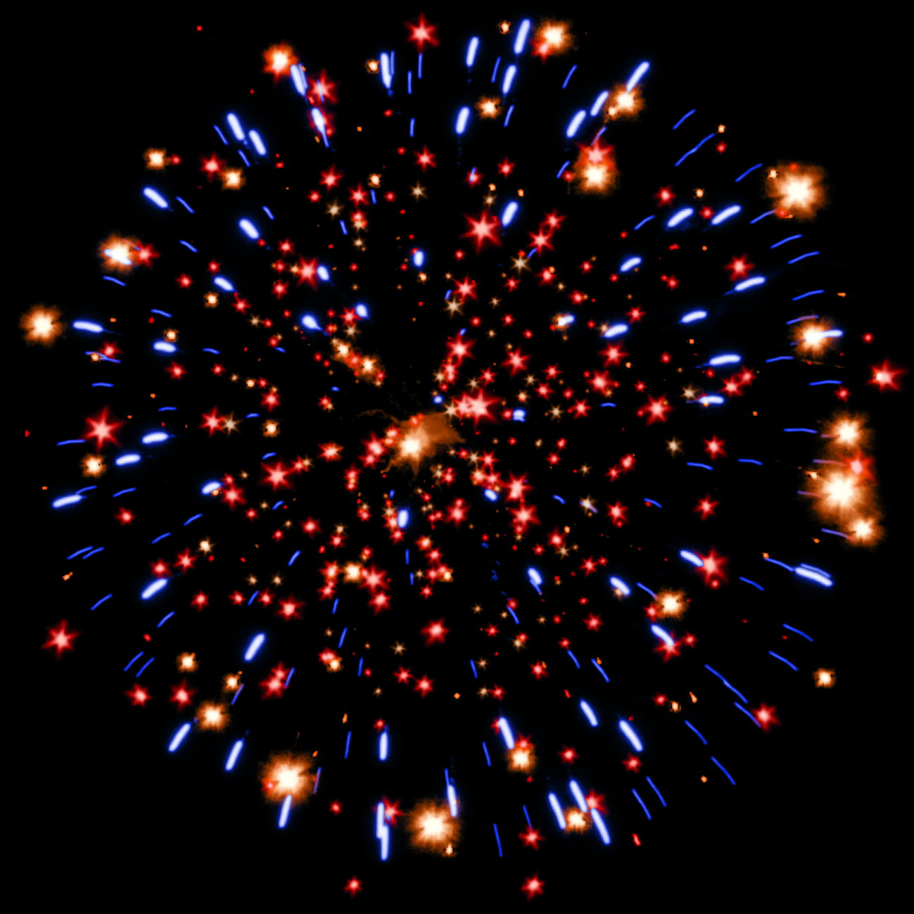 1-2. красных, синих и серебряных трещащих, золотых мерцающих огней;
