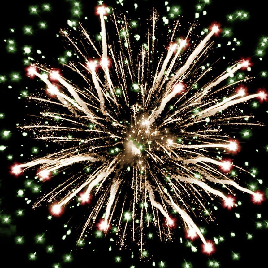 1-2. серебряных форсов с красными, зелёными огнями, серебряными трещащими искрами на концах и мерцающих зелёных, красных огней;
