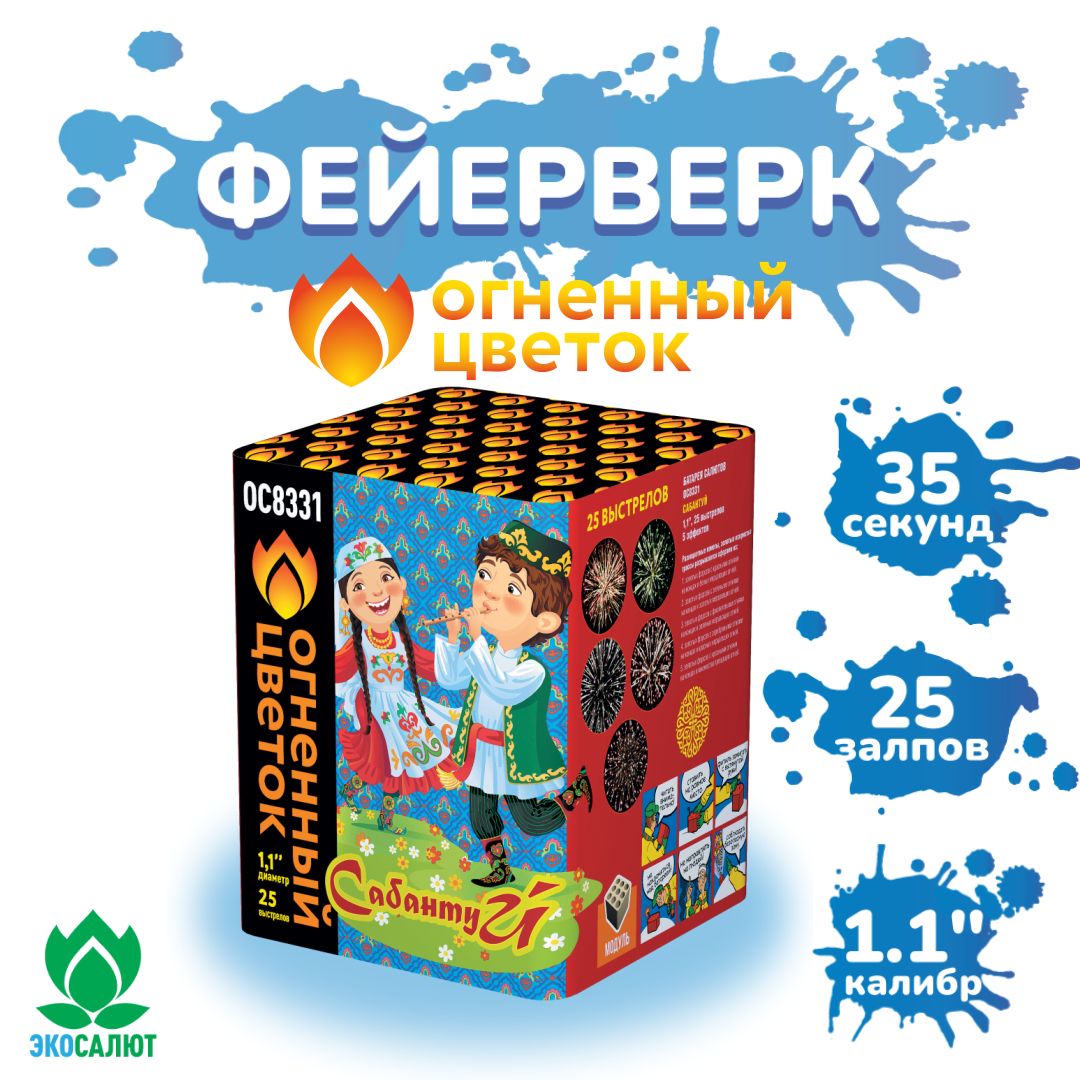 Любимейший праздник татарского народа, одновременно древний и новый, праздник труда, в котором сливаются воедино красивые обычаи народа, его песни, пляски, обряды. Название праздника происходит от тюркских слов: сабан - плуг и туй - праздник.Батарея салютов "Сабантуй" от "Русской пиротехники" - это яркое и впечатляющее шоу. Каждый выстрел - это точно расставленный акцент, создающий потрясающие комбинации цветов и форм, напоминающие о традициях и культуре этого праздника.Фейерверк приносит радость и восторг, он позволяет каждому участнику сабантуя почувствовать себя частью большой и яркой традиции!Эффекты (изображены на картинке):Разноцветные кометы, золотые искристые трассы разрываются сферами из золотых форсов с: