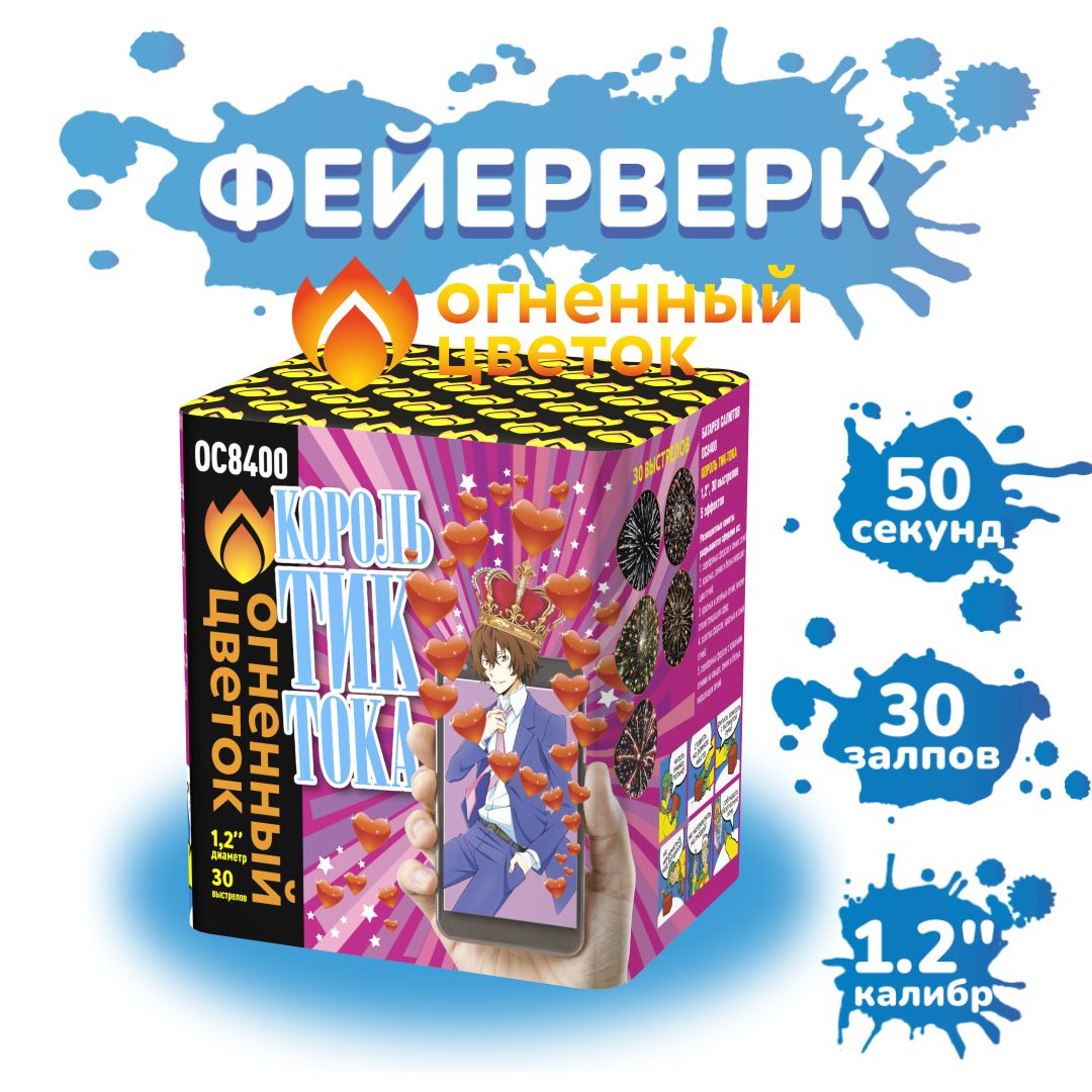 TikTok: здесь рождаются тренды и с этим сложно спорить. Соцсеть, безумно популярная среди молодежи. Батарея салютов "Король Тик-Тока" от "Русской пиротехники" является символом времени и движения, отражая течение и радость, которую мы испытываем во время праздника. Он приносит волшебство и веселье в нашу жизнь, напоминая нам о важности наслаждаться каждым мгновением.Этот фейерверк является прекрасным способом отметить особый день или событие и подарить людям незабываемые впечатления.Эффекты (изображены на картинке):Разноцветные кометы разрываются сферами из:
