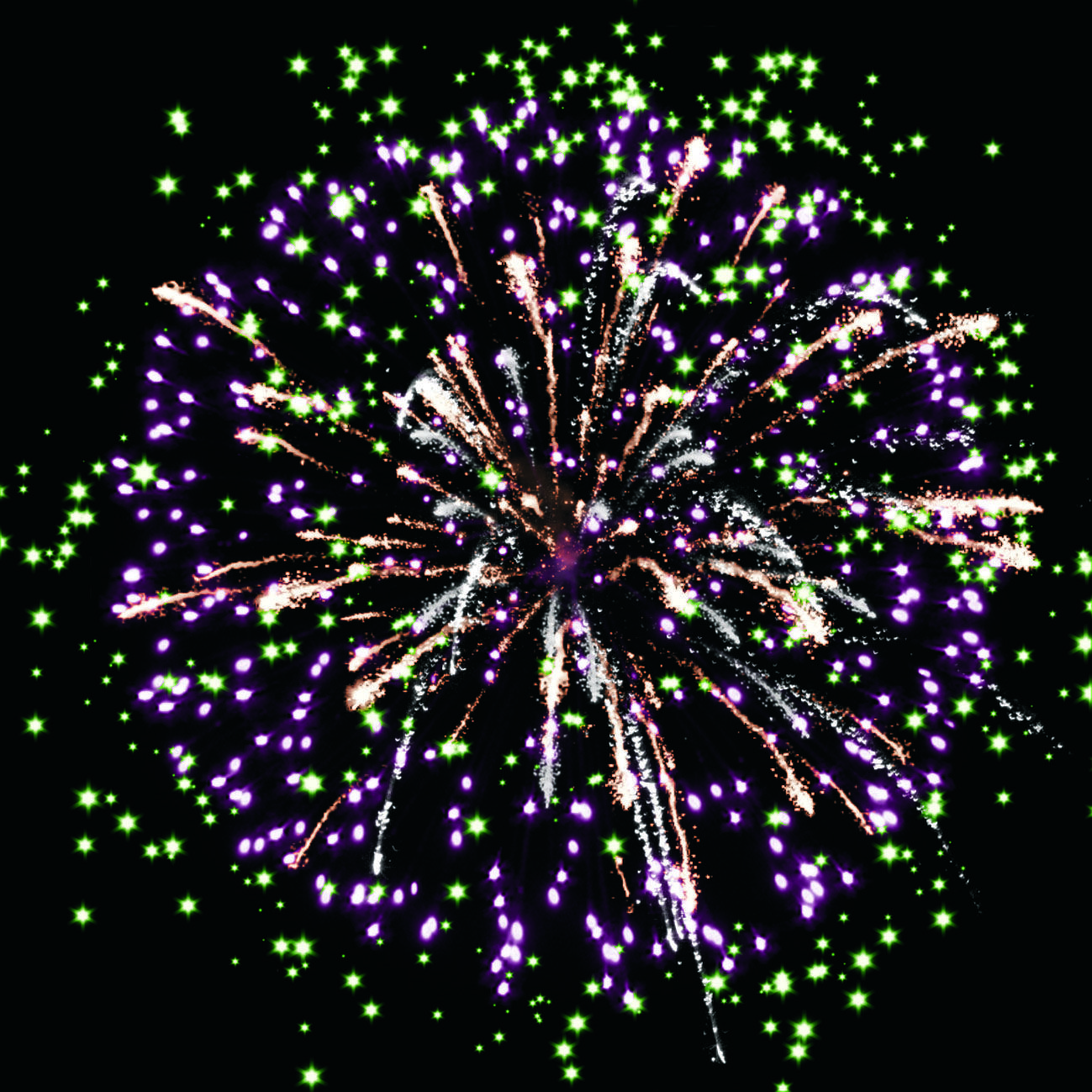 4. фиолетовых огней, переходящих в короткие серебряные форсы, и зелёных мерцающих огней;