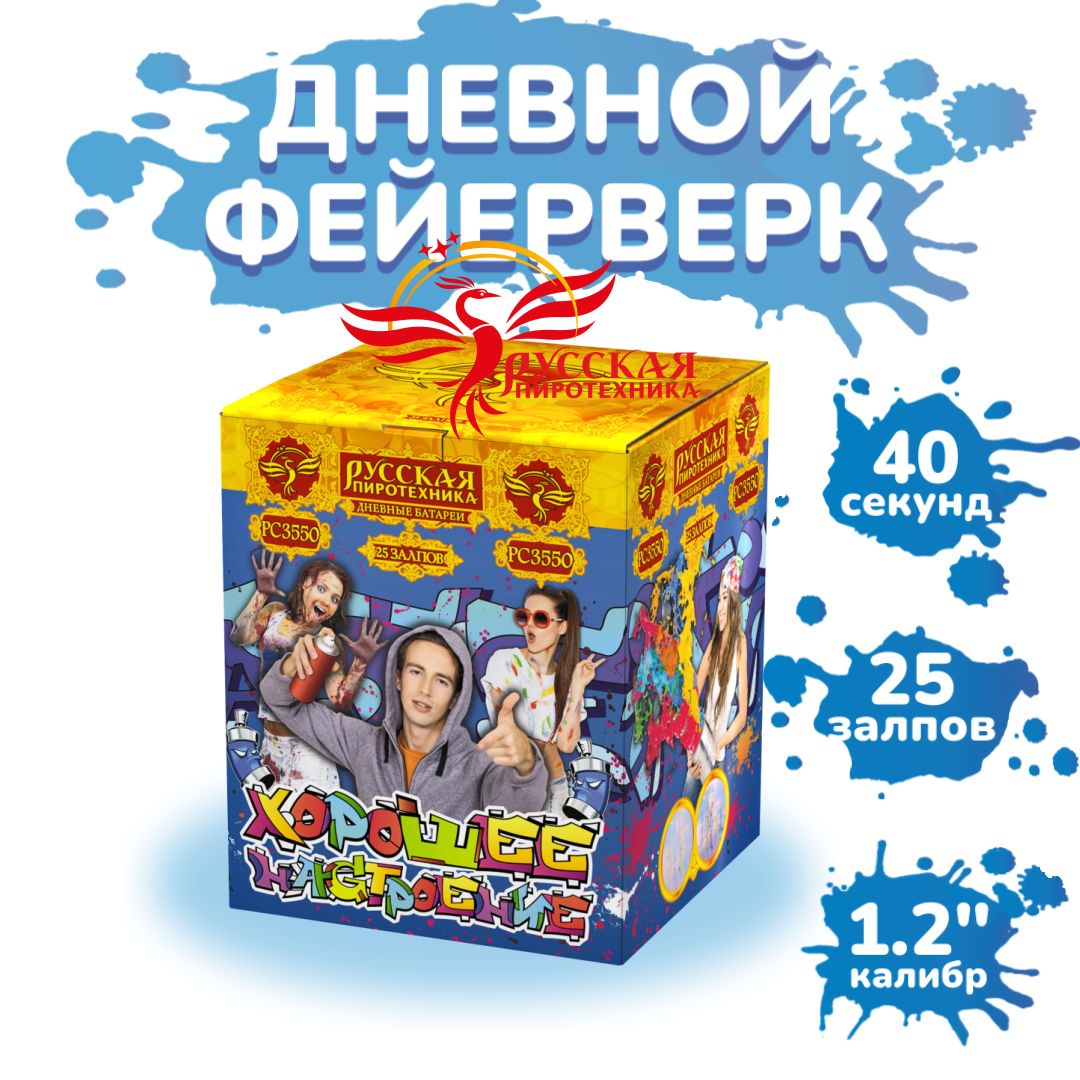 Любая положительная эмоция повышает работоспособность нервной системы, улучшает сон, стабилизирует эмоциональное состояние, способствует выработке гормонов радости (эндорфины) и оказывает позитивное влияние на гормональный фон организма.Чем больше положительных эмоций ощущает человек, тем меньше он подвержен стрессу и различным заболеваниям.Дневной фейерверк "Хорошее настроение" от "Русской пиротехники" обеспечит Вам и положительные эмоции и праздничное настроение! Каждый взрыв – это настоящая симфония красок: зеленые, синие, красные, фиолетовые – все они танцуют в воздухе, создавая неповторимую картину!Эффекты (изображены на картинке):Трещащие серебряные огни и цветные дымовые трассы: