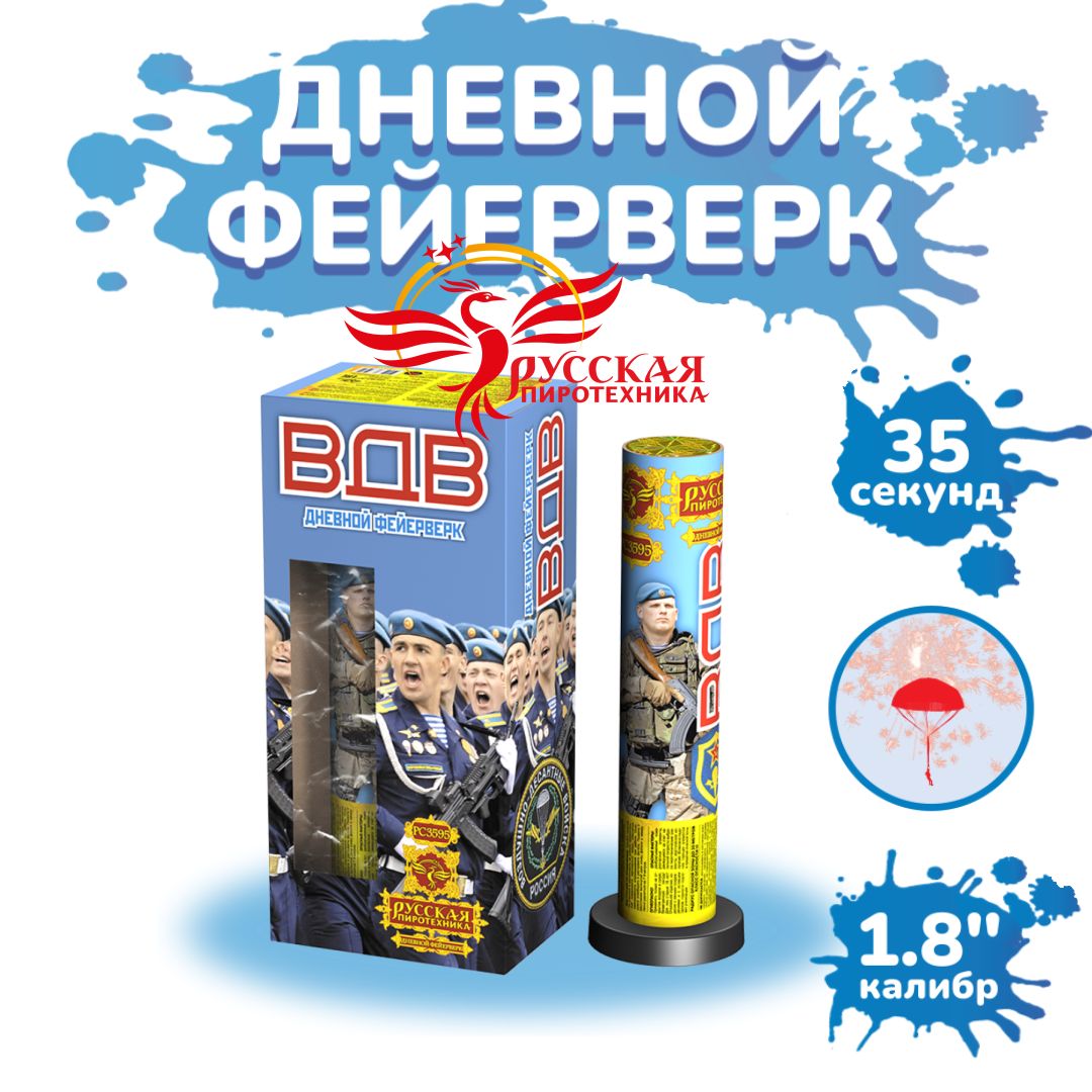 Воздушно-десантные войска, которые являются одним из видов Вооруженных Сил Российской Федерации. ВДВ специализируются на проведении десантных операций и операций воздушной мобильности.Дневной фейерверк "ВДВ" от "Русской пиротехники" высадит десант там, где Вы пожелаете. Грандиозное зрелище, доступное буквально каждому!Эффекты (изображены на картинке):Выстреливает в небо серебряные трещащие искры и игрушечного солдатика, спускающегося на землю на бумажном парашюте.