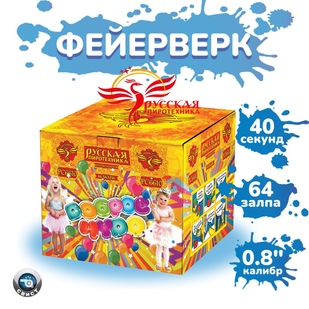 У радости все радостно, у света все светло, у чуда все чудесно, а у тепла — тепло.Невероятное шоу, которое превратит Ваш праздник в настоящее волшебство. Эта батарея салютов создаст удивительные и красочные образы, напоминающие чудеса и волшебные сказки.С первого выстрела, когда первый залп взлетает в небо, "Доброе чудо" начинает свое захватывающее представление. Яркие и мерцающие огни превращаются в разнообразные фигуры и фейерверки, создавая потрясающую картину. Огромные композиции, вихри света и цветные огоньки наполняют атмосферу волшебством.Звуки фейерверка также не остаются незамеченными. Магические мелодии и гармоничные звуки сопровождают каждый новый эффект, добавляя воздуху загадочности и радости. Это настоящее произведение искусства от "Русской пиротехники"!Эффекты (изображены на картинке):Разноцветные, свистящие кометы, серебряные, шуршащие искристые трассы разрываются сферами из: