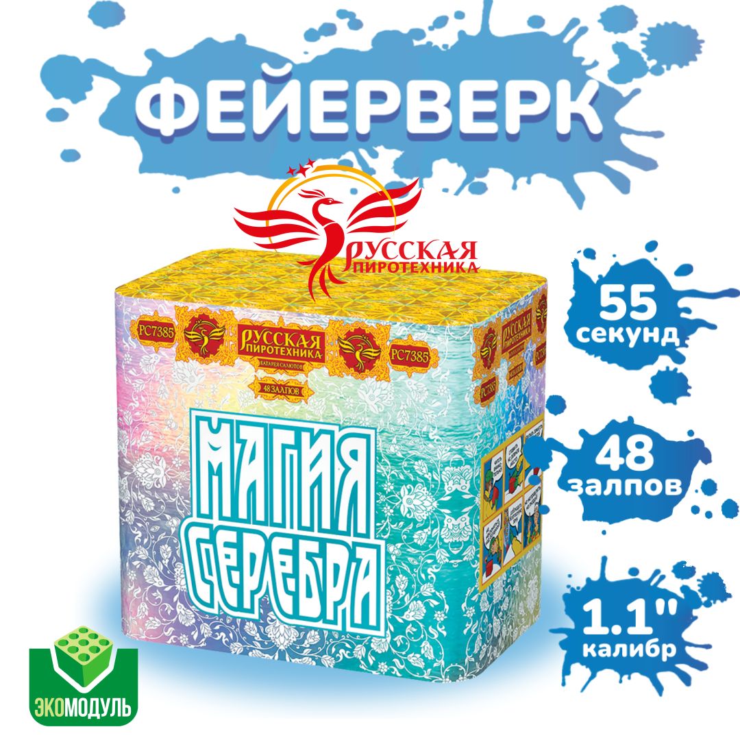 Серебро – металл чистый и девственный, хранящий в себе принцип неоскверненной чистоты, связан с Луной – покровительницей тайных знаний и сил. Ношение предметов из серебра способствует развитию природной интуиции (особенно у женщин) и других паранормальных способностей.Батарея салютов "Магия серебра" от "Русской пиротехники" так же защитит Вас от негативной энергии и станет незаменимым украшением будь то свадьба, день рождения или другое важное мероприятие.Это настоящая волшебная симфония света и красок, которая превратит любое мероприятие в незабываемое зрелище!Эффекты (изображены на картинке):Разноцветные кометы разрываются сферами из: