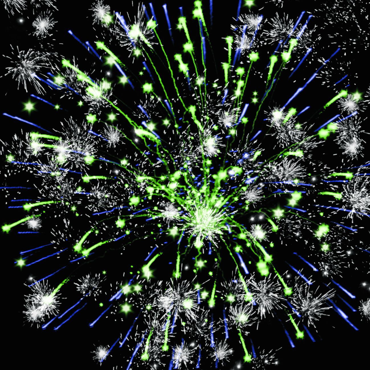 7. крупных зелёных и синих огней, множеством трещащих сфер.