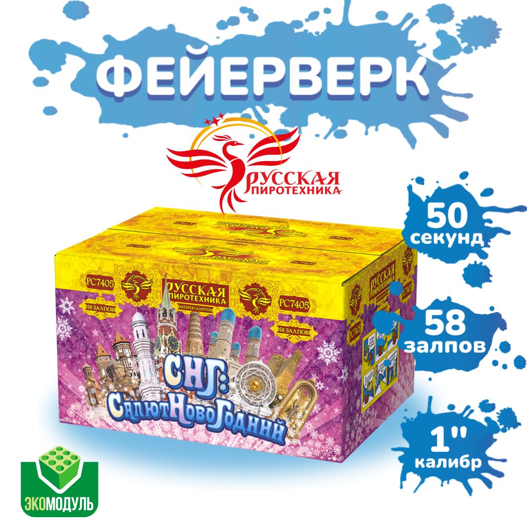 В новогоднюю ночь все взрослые на миг становятся детьми и тоже верят в чудо. Время новогодних праздников — это время красивой, доброй сказки, которая приходит в каждый дом в конце каждого года с наступлением зимних холодов.Он всегда вселяет в нас надежду на лучшее, дарит множество подарков и приятных эмоций. Батарея салютов "СНГ: Салют НовоГодний" от "Русской пиротехники" украсит этот чудесный и всеми любимый праздник, подарив Вам незабываемые впечатления!Окунитесь в сказку и насладитесь красочным м незабываемым пиротехническим шоу!Эффекты (изображены на картинке):Разноцветные кометы разрываются сферами из: