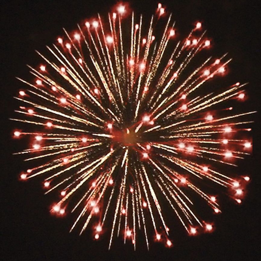 8-9. золотых форсов с белыми мерцающими искрами на концах, красных и зелёных огней.