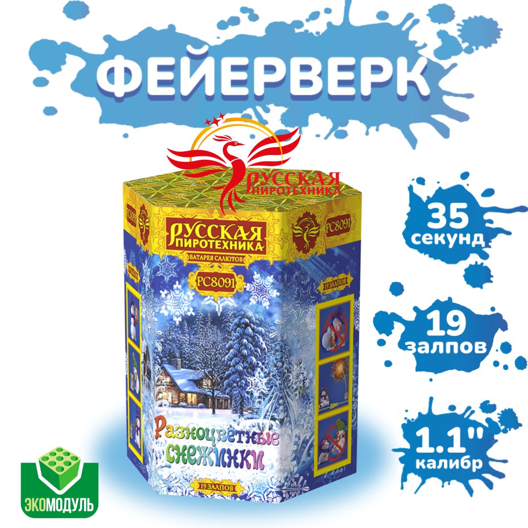 Фейерверк "Разноцветные снежинки" от "Русской пиротехники" - это невероятно красивое и волшебное шоу, которое превратит ваш праздник в настоящую сказку. Когда первые ракеты взлетают в небо, вы сразу ощущаете, что попали в мир волшебства и красок. Яркие огни и вспышки создают потрясающие комбинации, напоминающие падающие с неба разноцветные снежинки. Они сверкают и переливаются всеми оттенками радуги, словно создавая свой собственный магический танец. Эффекты (изображены на картинке): Разноцветные кометы разрываются множеством трещащих сфер, сферами из золотых форсов и цветных огней: