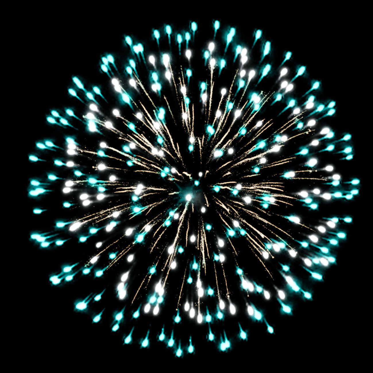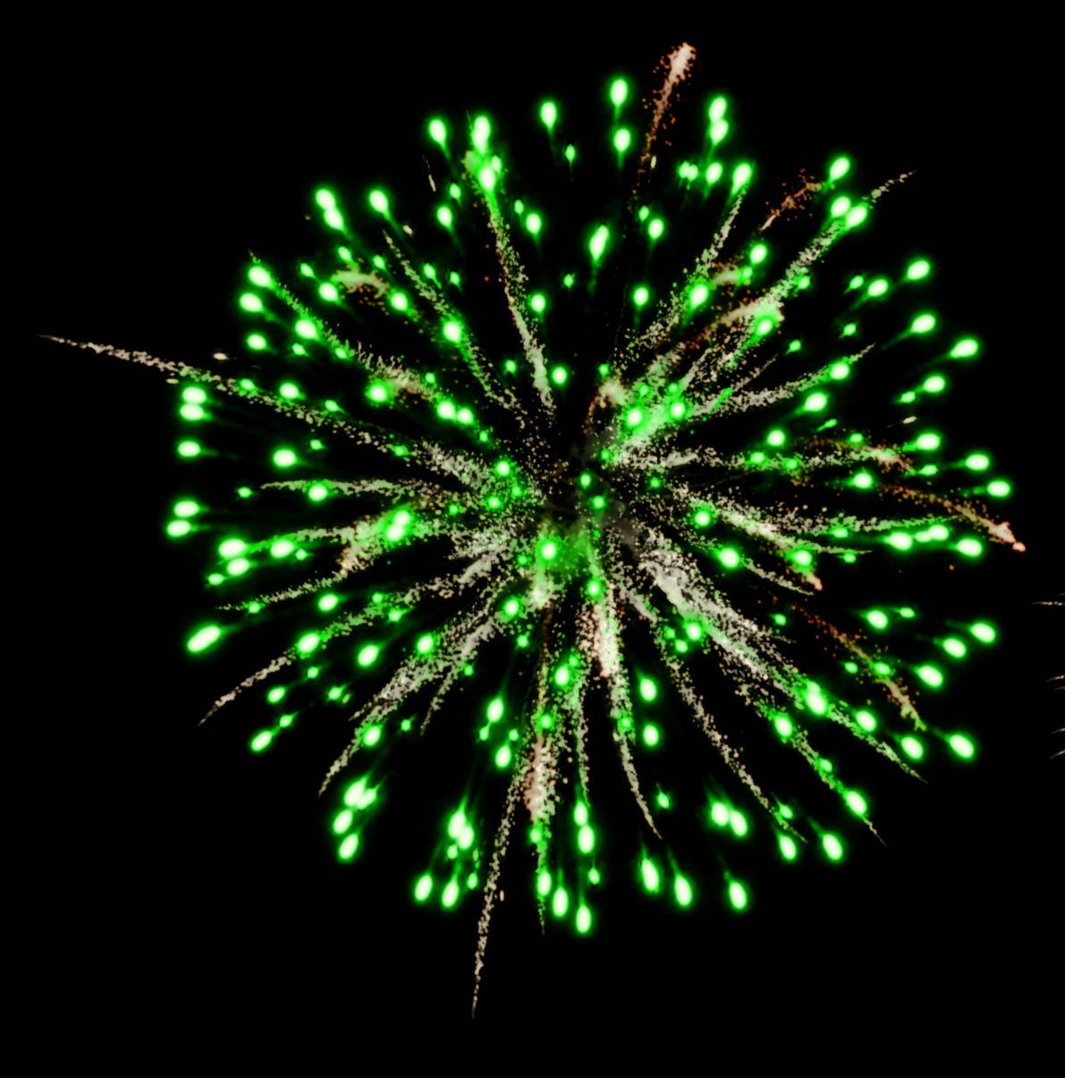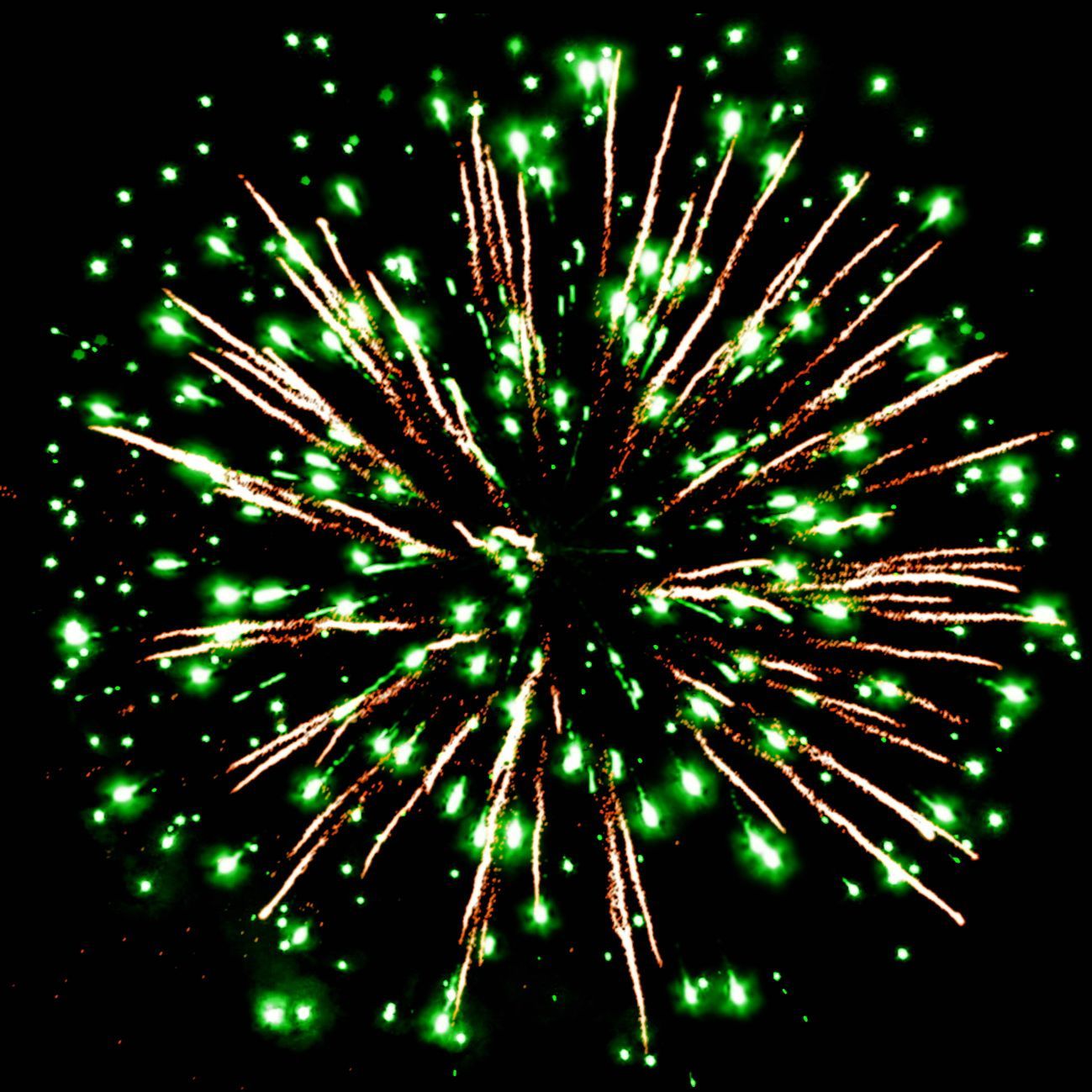 5. зелёных мерцающих огней и золотых форсов с серебряными шуршащими искрами (залп).