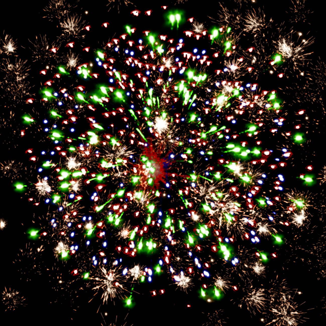 12. красных, зелёных и синих огней, множеством трещащих сфер;