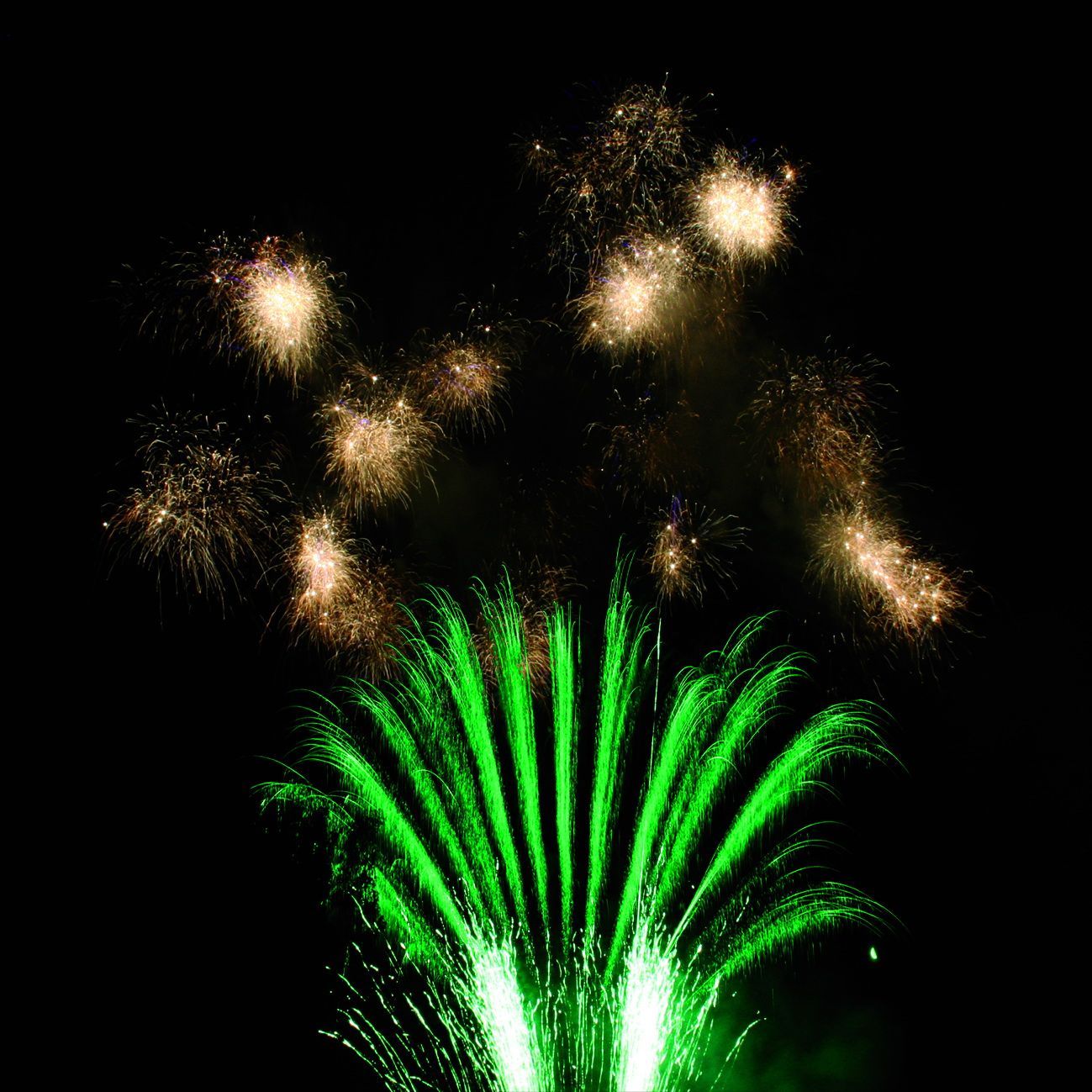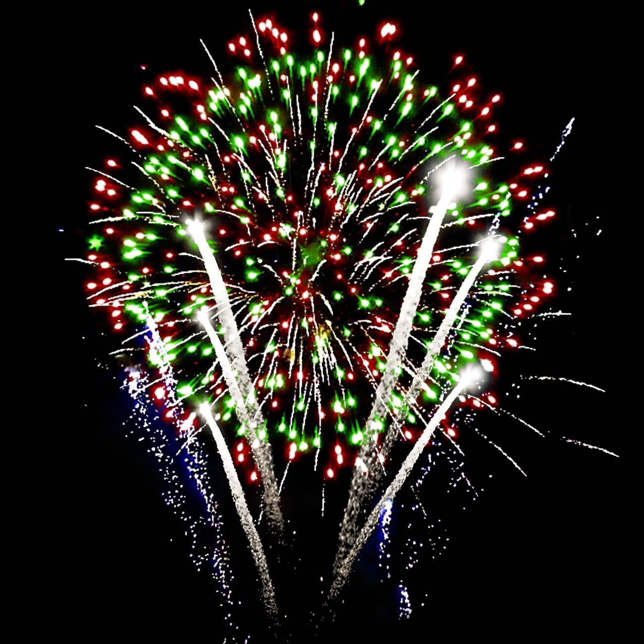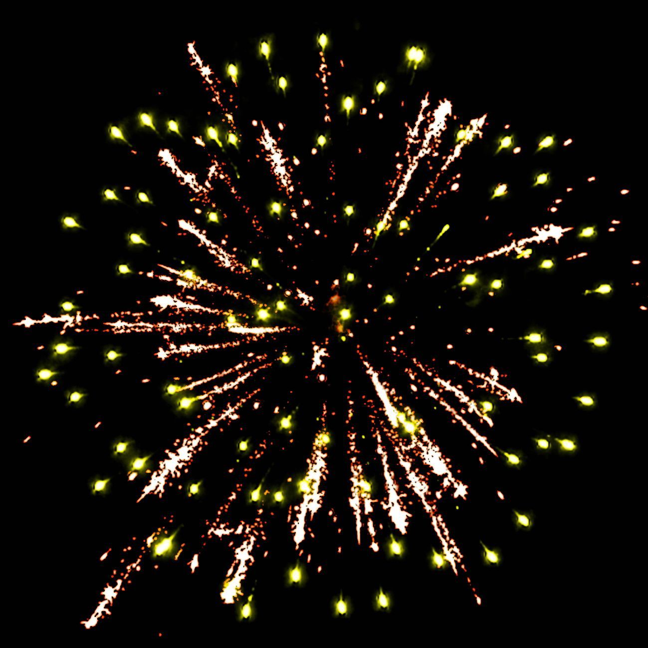 13. Веер: серебряные искристые трассы, сферы из золотых форсов, красных и зелёных огней.