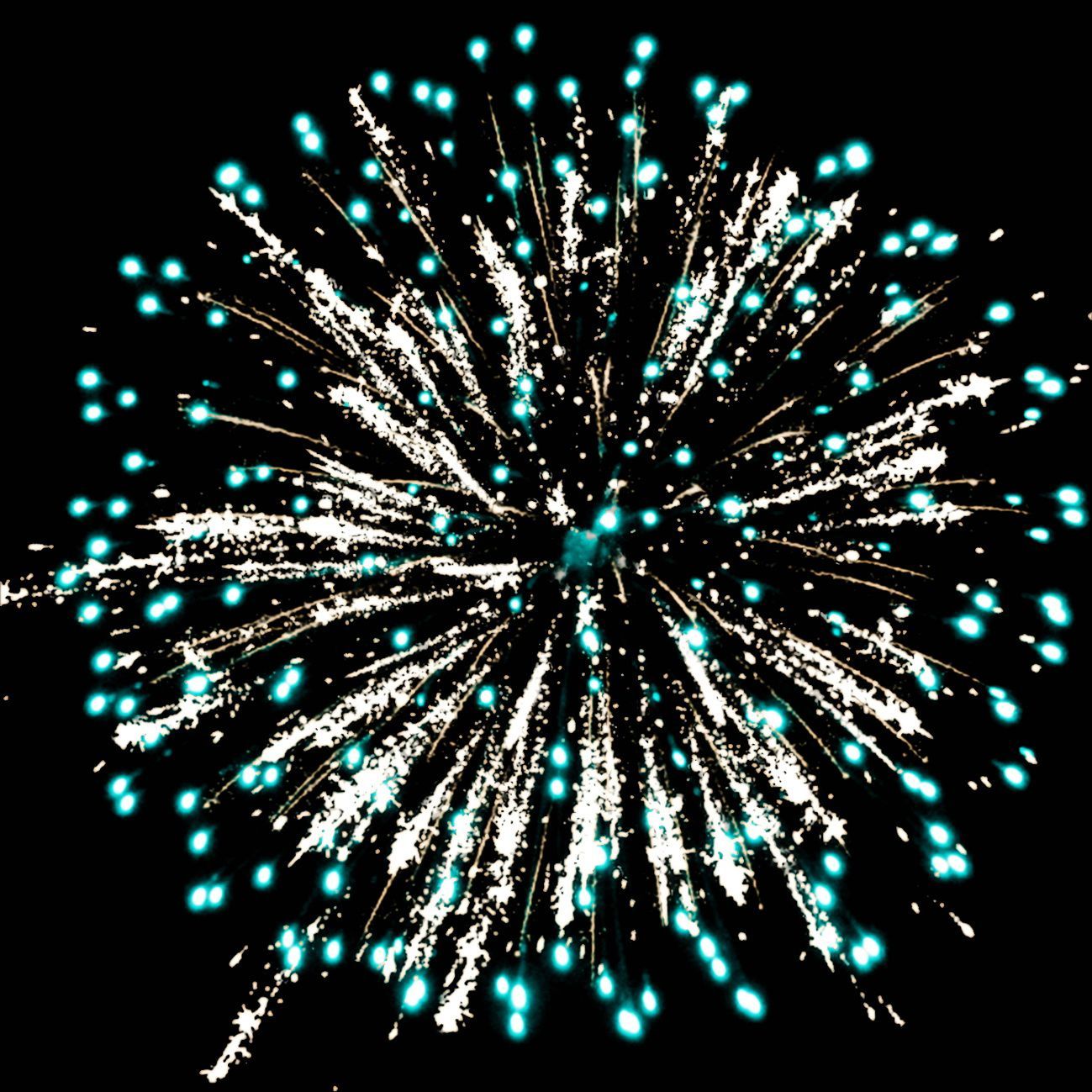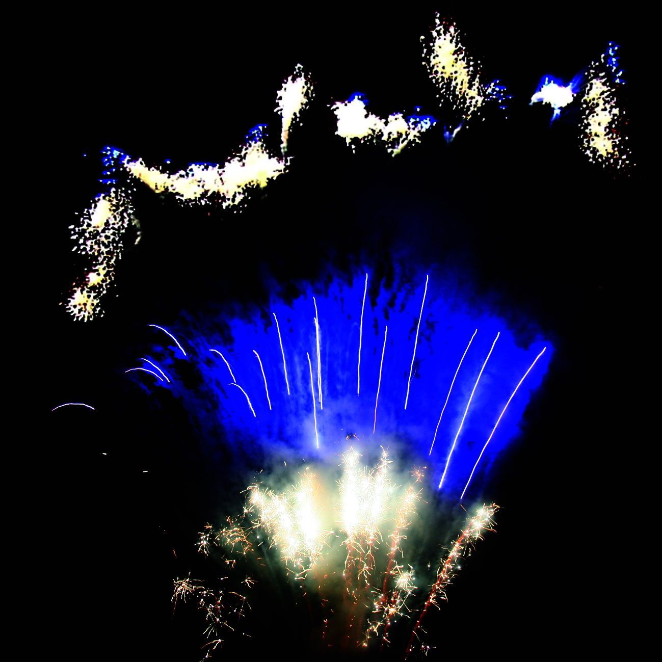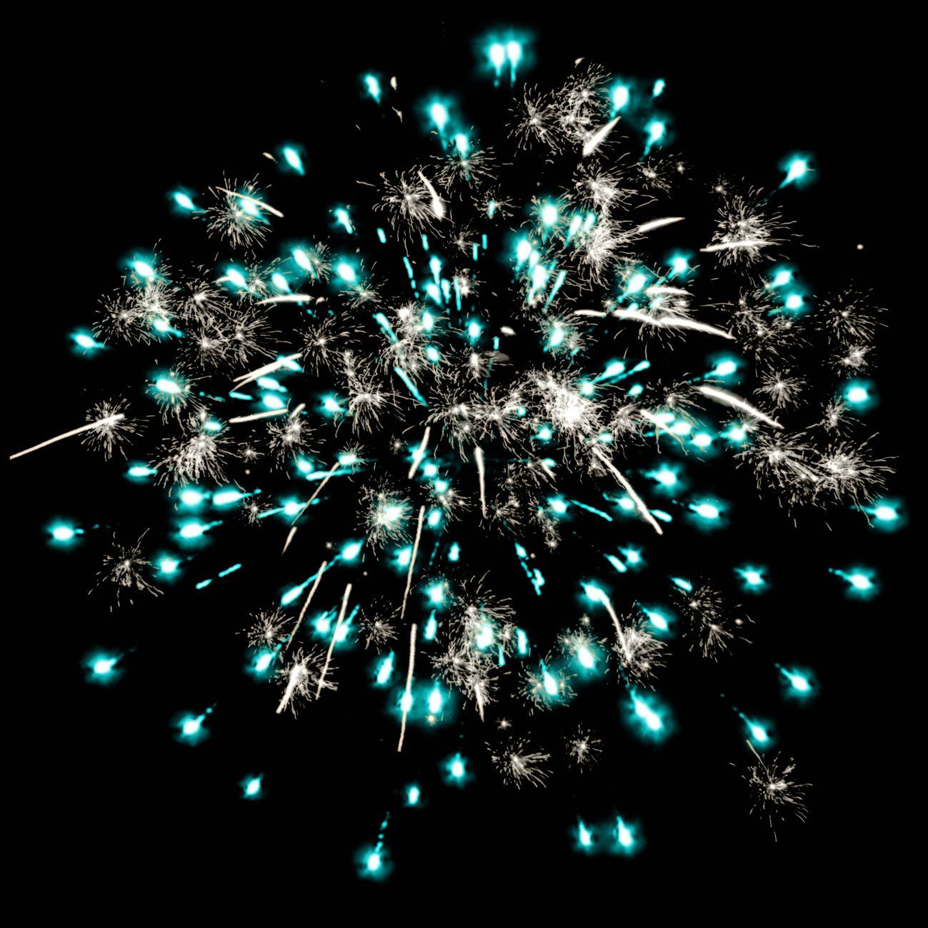 4. веер: букет из синих и трещащих огней внизу и букетики из синих и трещащих серебряных огоньков наверху. Верхний уровень. Разноцветные кометы разрываются сферами из: