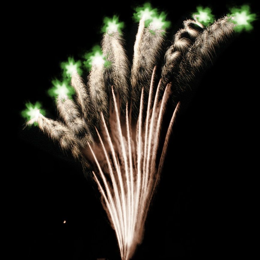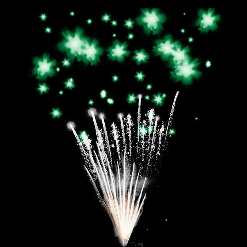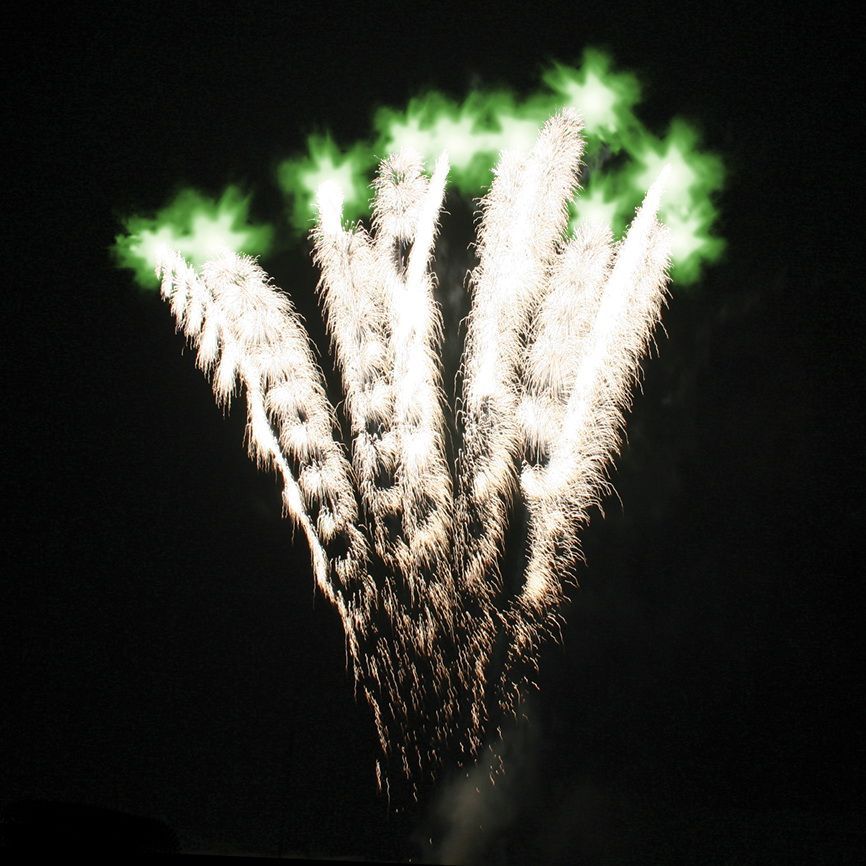 9-10. Веер. Серебряные трассы с трещащими искрами с зелёными огнями на концах(Z-образный, W-образный веер).