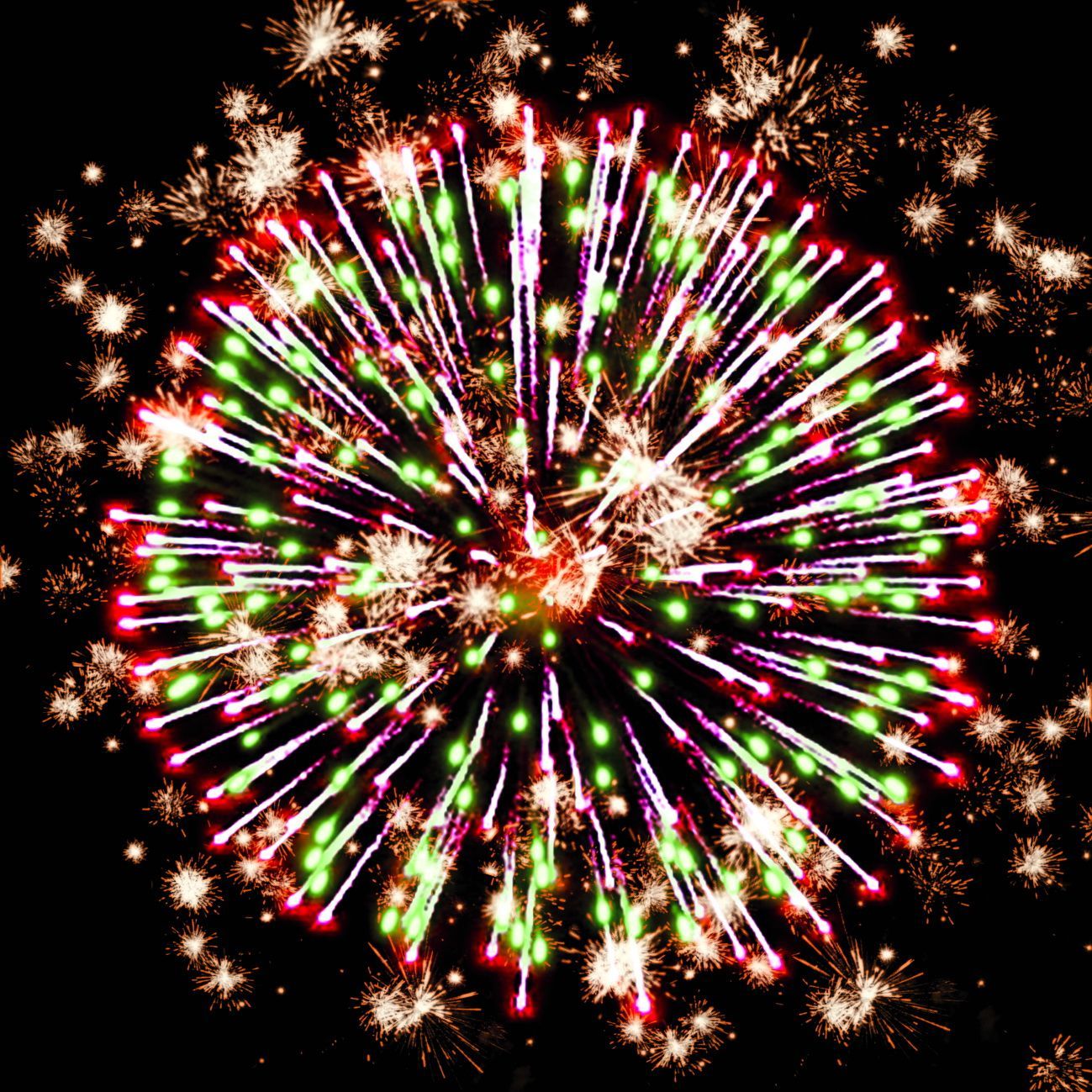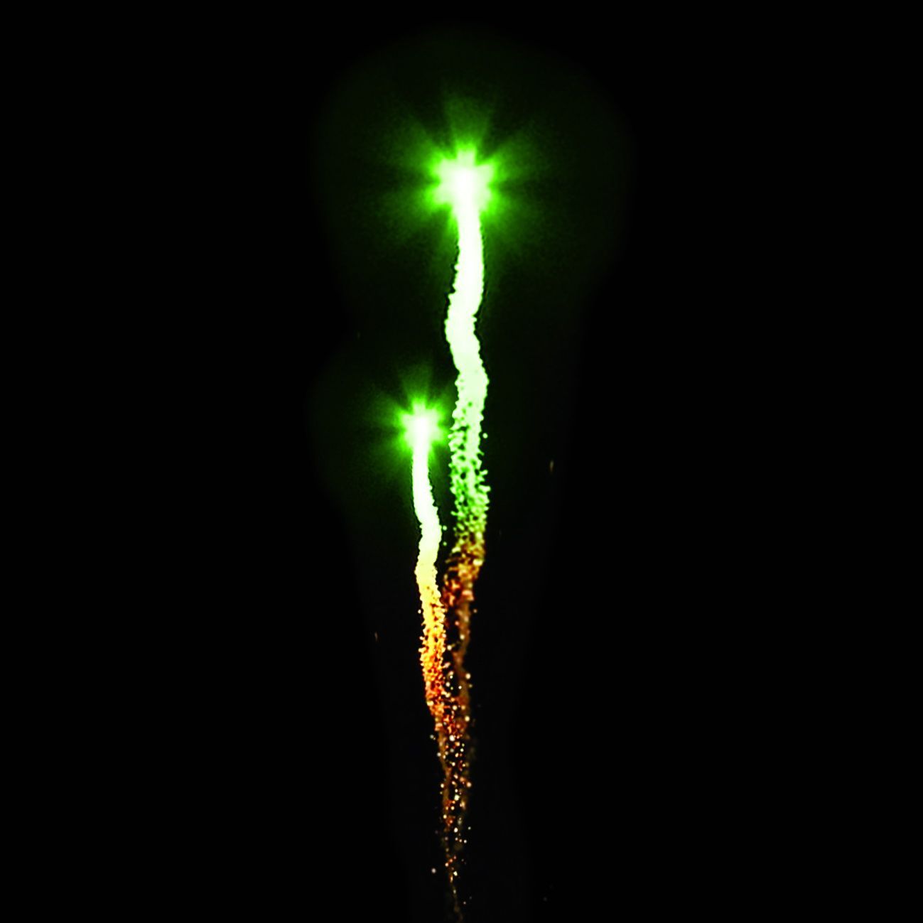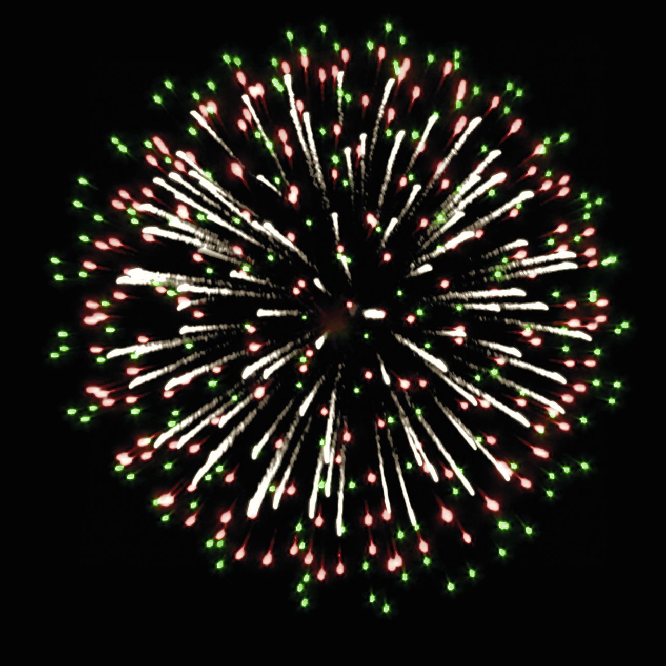 11. Веер. Спиралевидные трассы, букеты из серебряных мерцающих огней на концах, сферы из серебряных форсов, красных, зелёных и трещащих золотых огней.