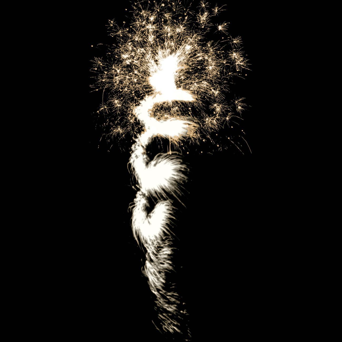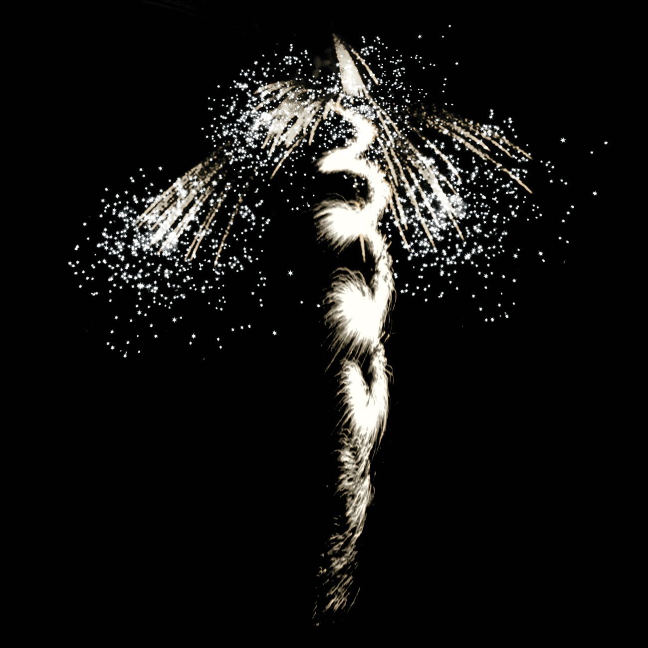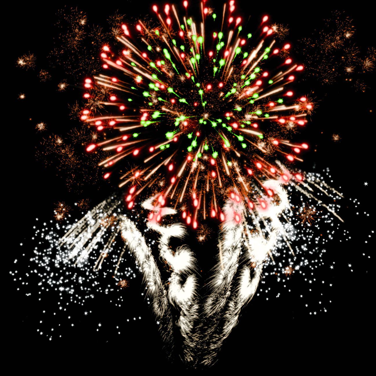 11. Веер. Спиралевидные трассы, букеты из серебряных мерцающих огней на концах, сферы из серебряных форсов, красных, зелёных и трещащих золотых огней.