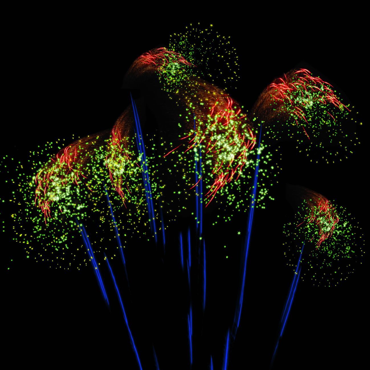 4. Спиралевидные трассы и сферы из трещащих огней. Разноцветные кометы разрываются сферами из: