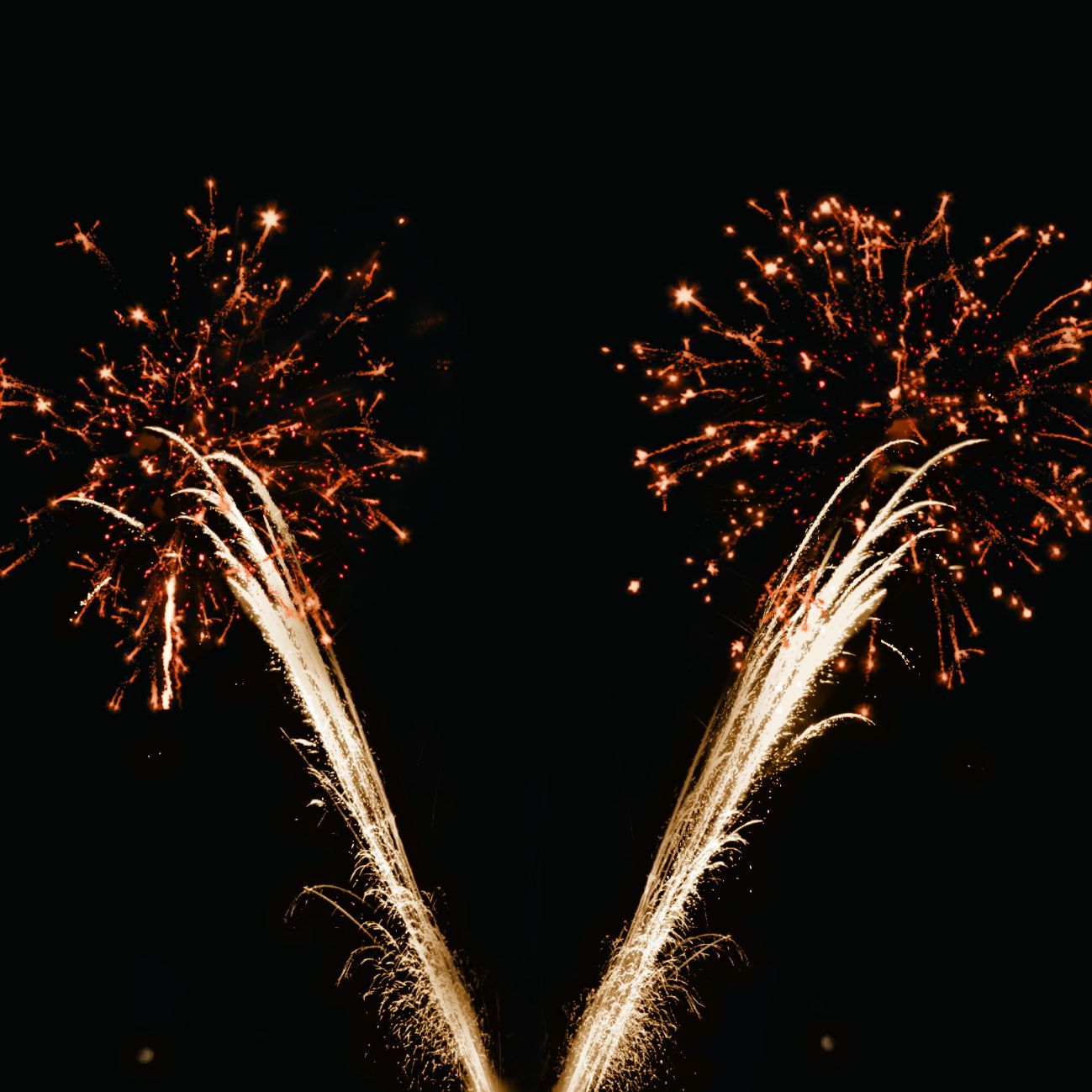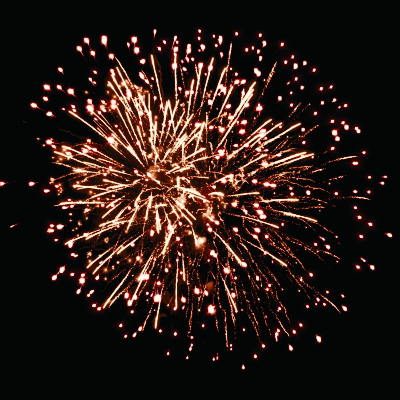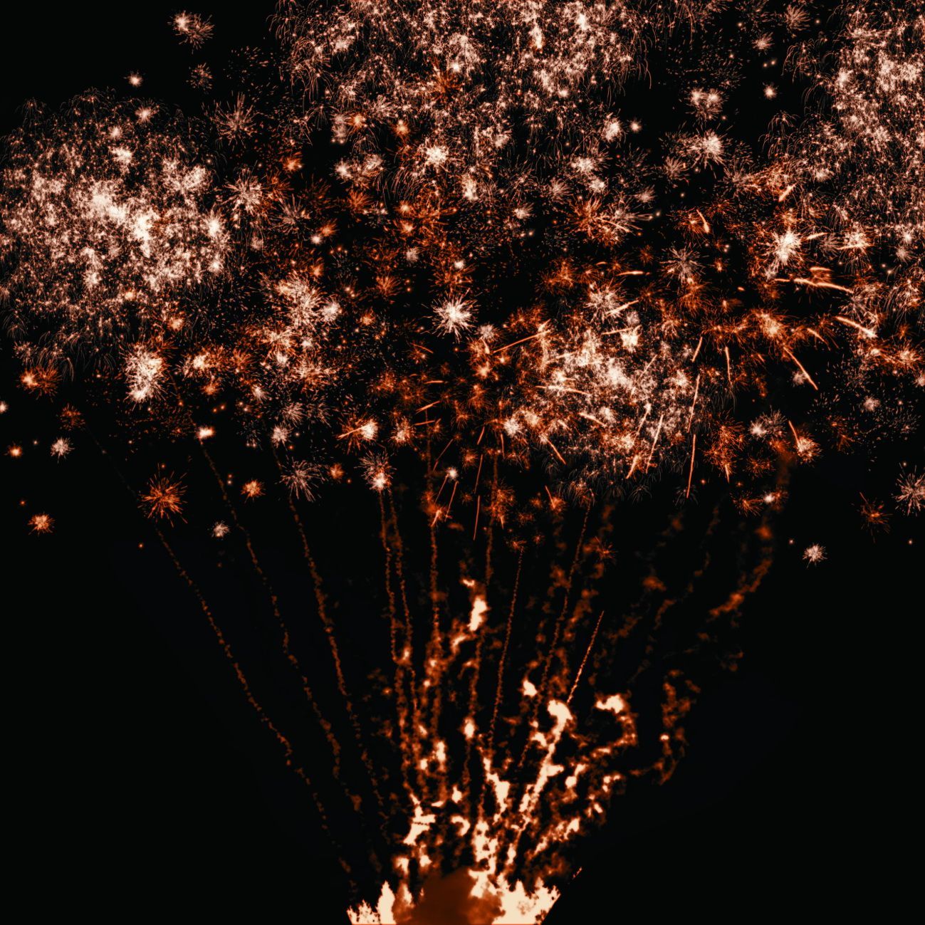 6. Веер. Золотые искристые трассы, букеты из красных мерцающих и разлетающихся серебряных огоньков.