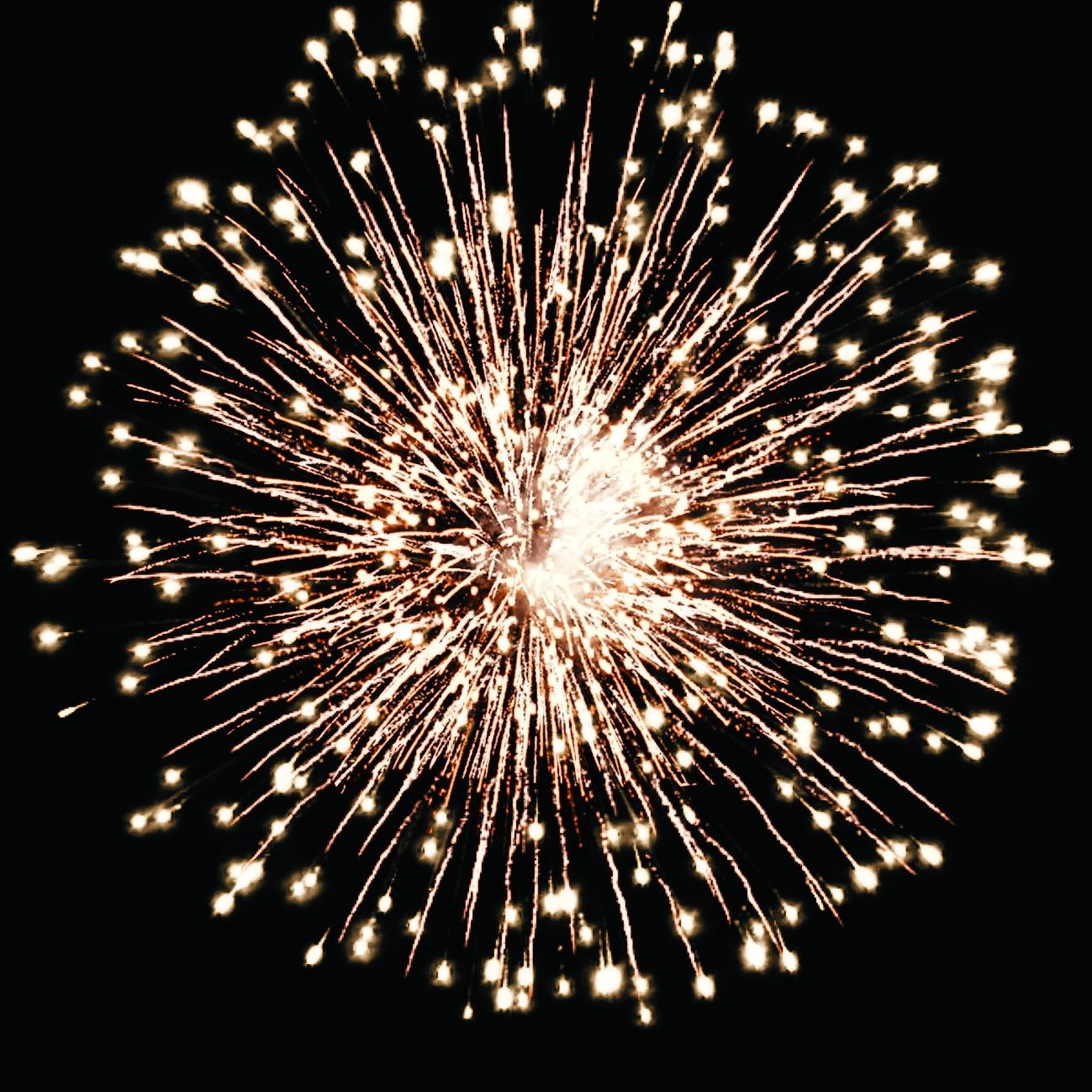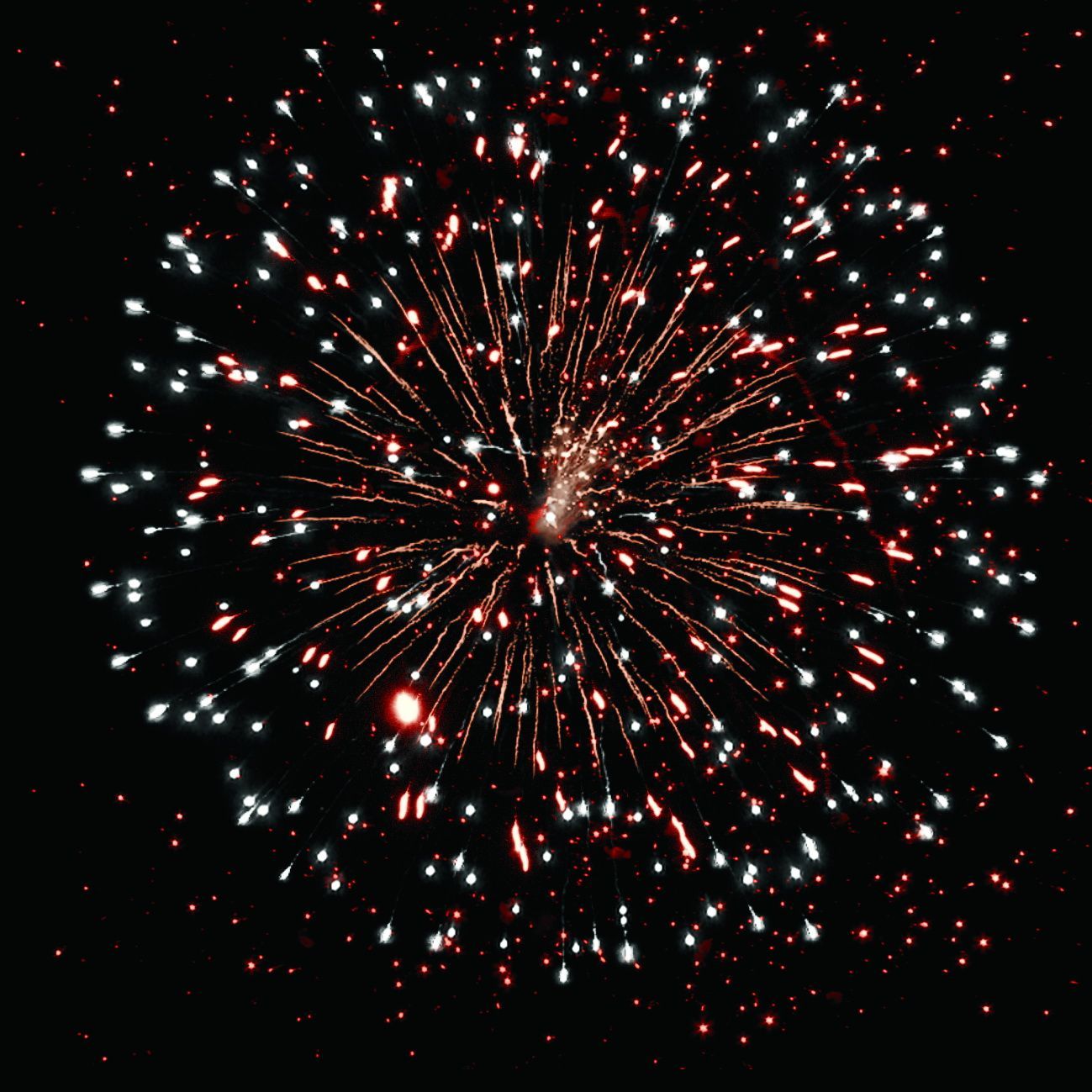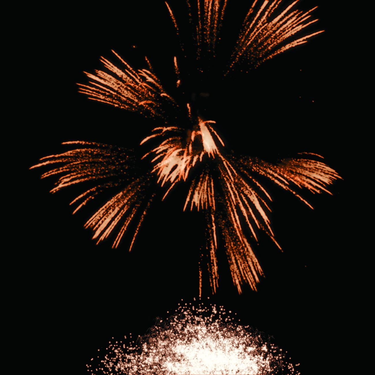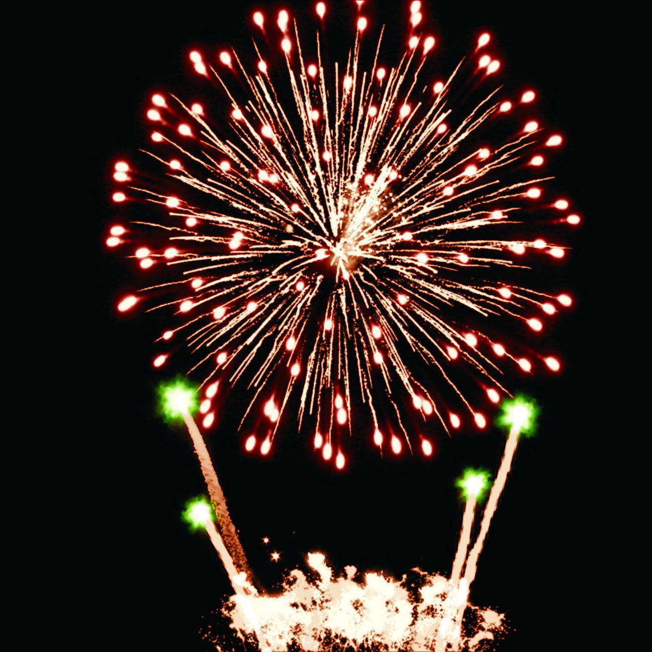 6. Веер. Золотые искристые трассы, букеты из красных мерцающих и разлетающихся серебряных огоньков.