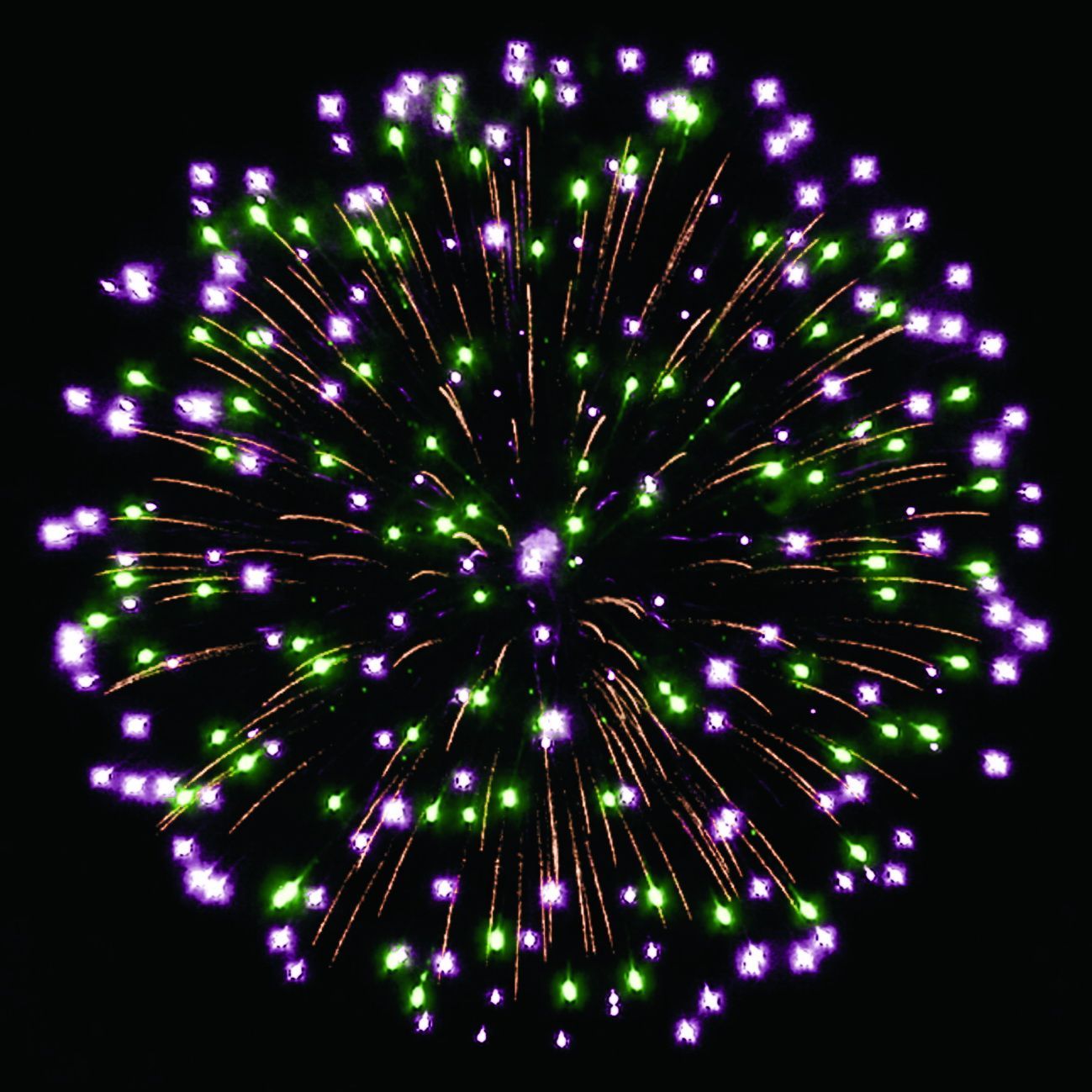 1-3. красных, белых мерцающих, зелёных, фиолетовых, оранжевых, синих, трещащих огней;