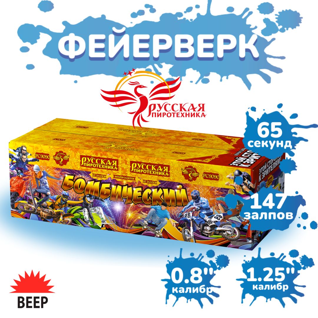 Фейерверк "Бомбический" от "Русской пиротехники" переносит зрителей в мир необыкновенных эмоций и ярких красок, создавая потрясающую атмосферу взрывного праздника.Узоры и фигуры, сотворенные огненными лучами и яркими искрами, заполняют небо, будто оно само загорается огнем.Представление завершается финальными зарядами, наполняющими небо множеством ярких искр и огненных шаров. Батарея салютов "Бомбический" оставляет незабываемые впечатления своей красотой и мощью!Эффекты (изображены на картинке):Нижний уровень.Букеты из серебряных трещащих огоньков.Верхний уровень. Разноцветные кометы, серебряные трассы разрываются сферами из: