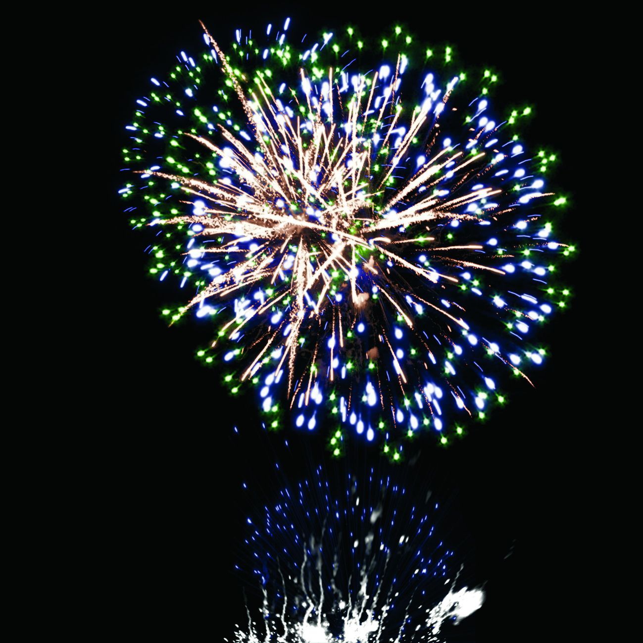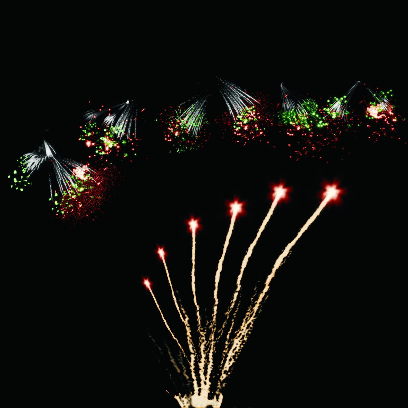 6-7. золотых форсов с серебряными искрами, зелёных, синих, красных и трещащих огней;