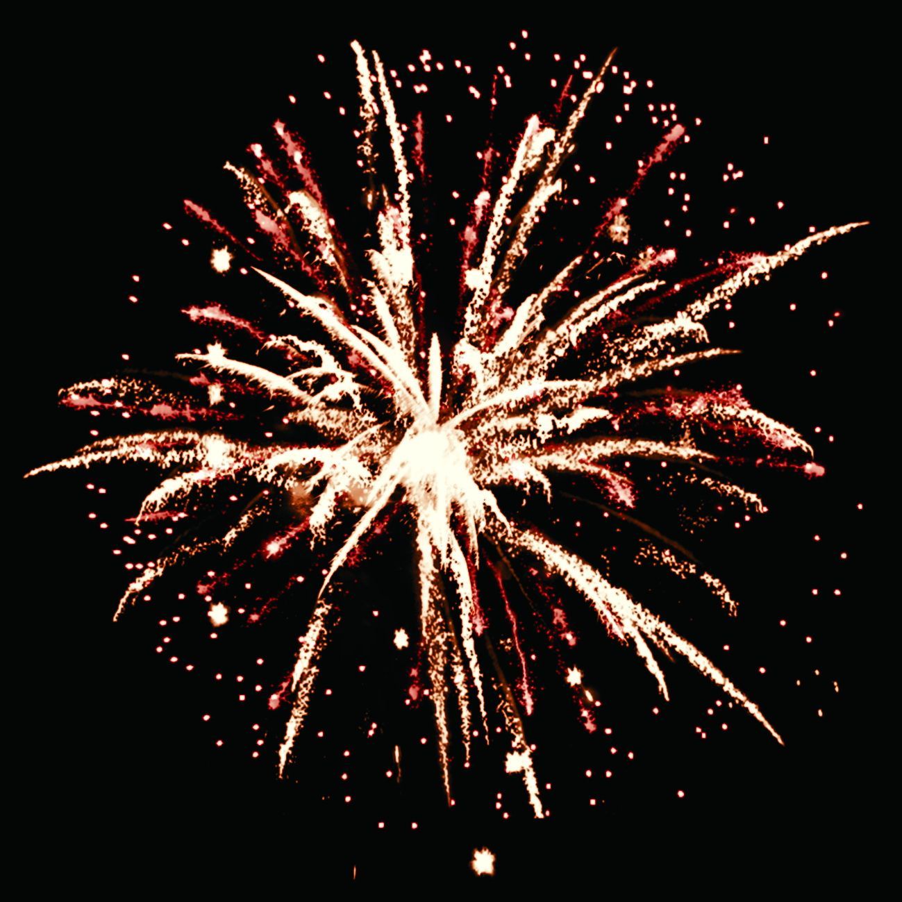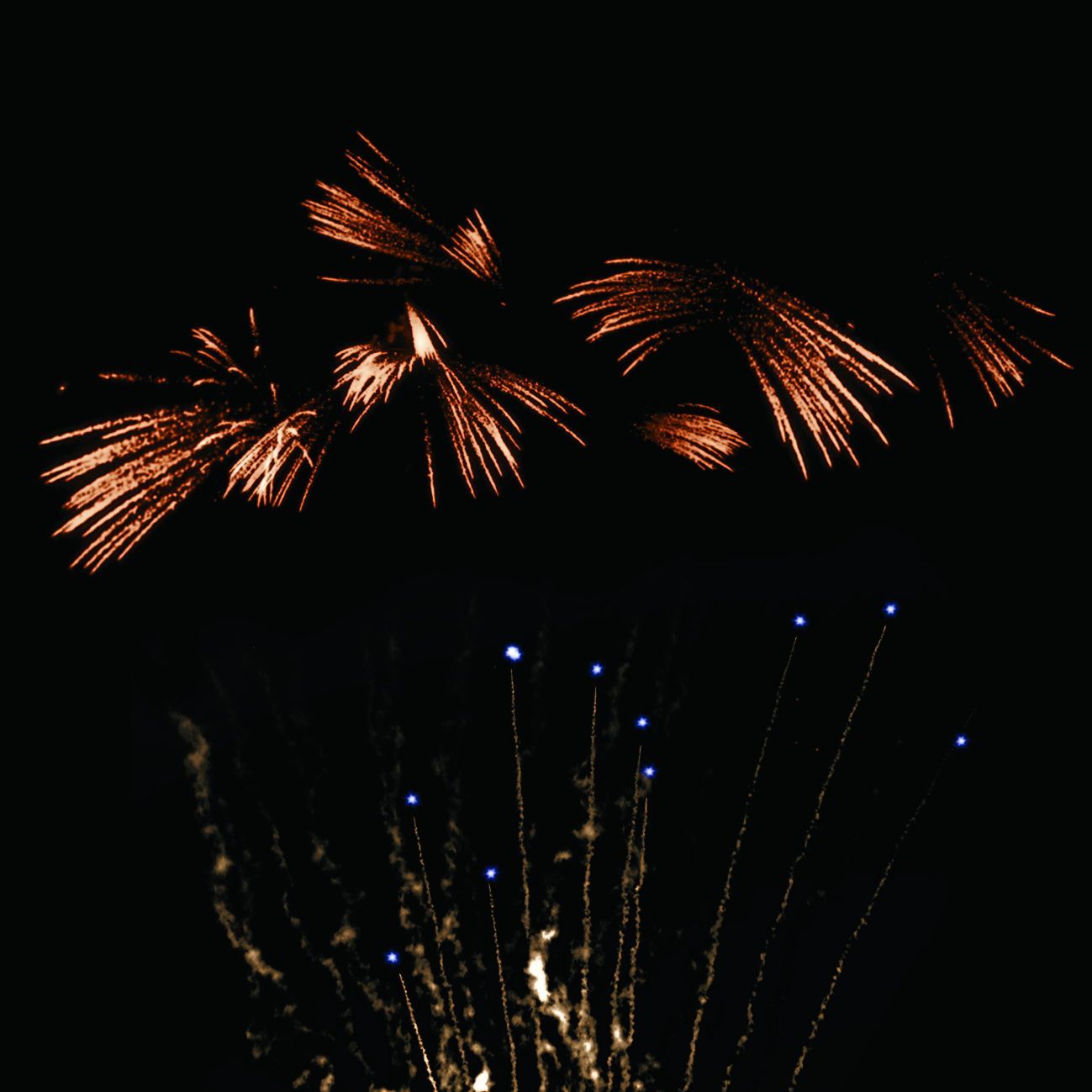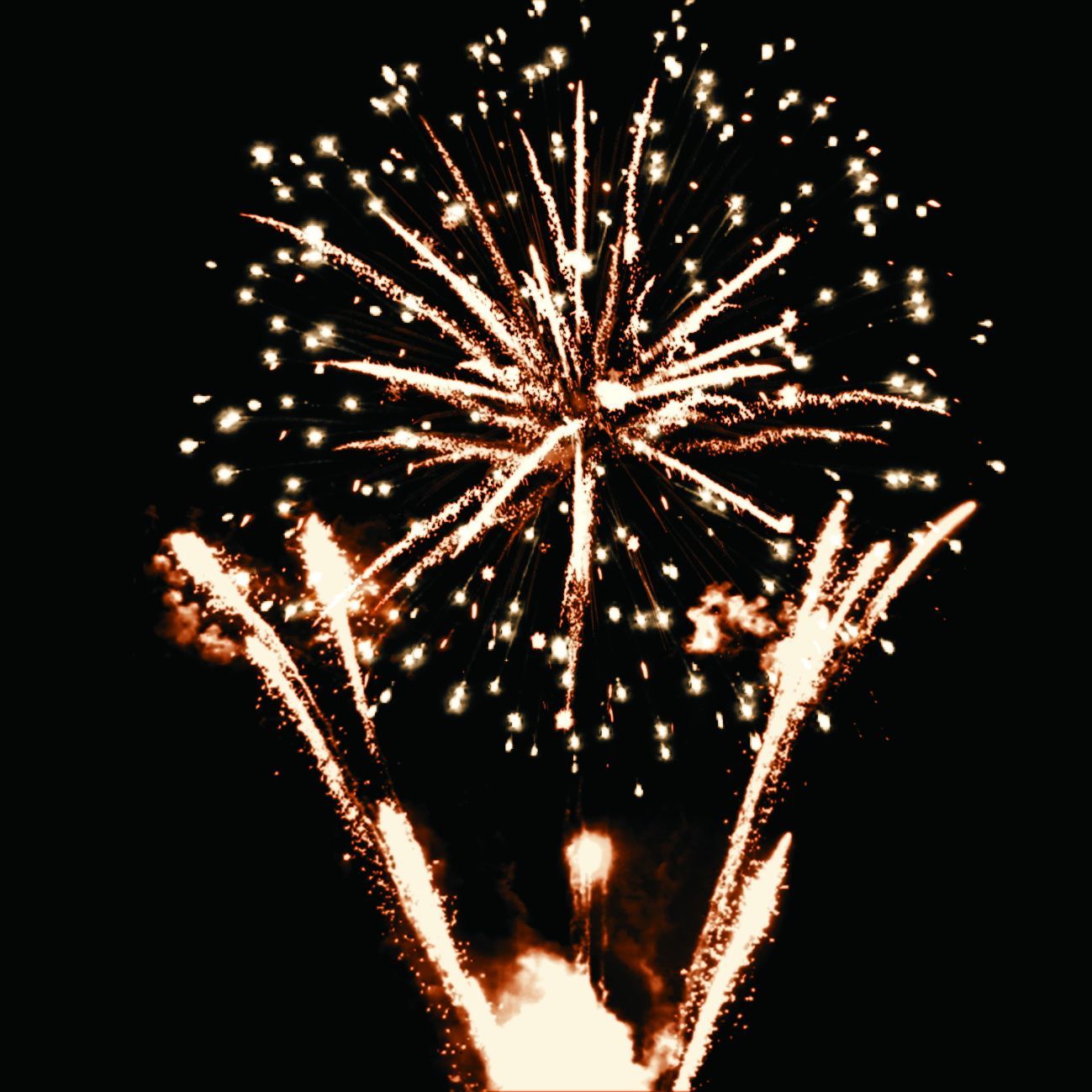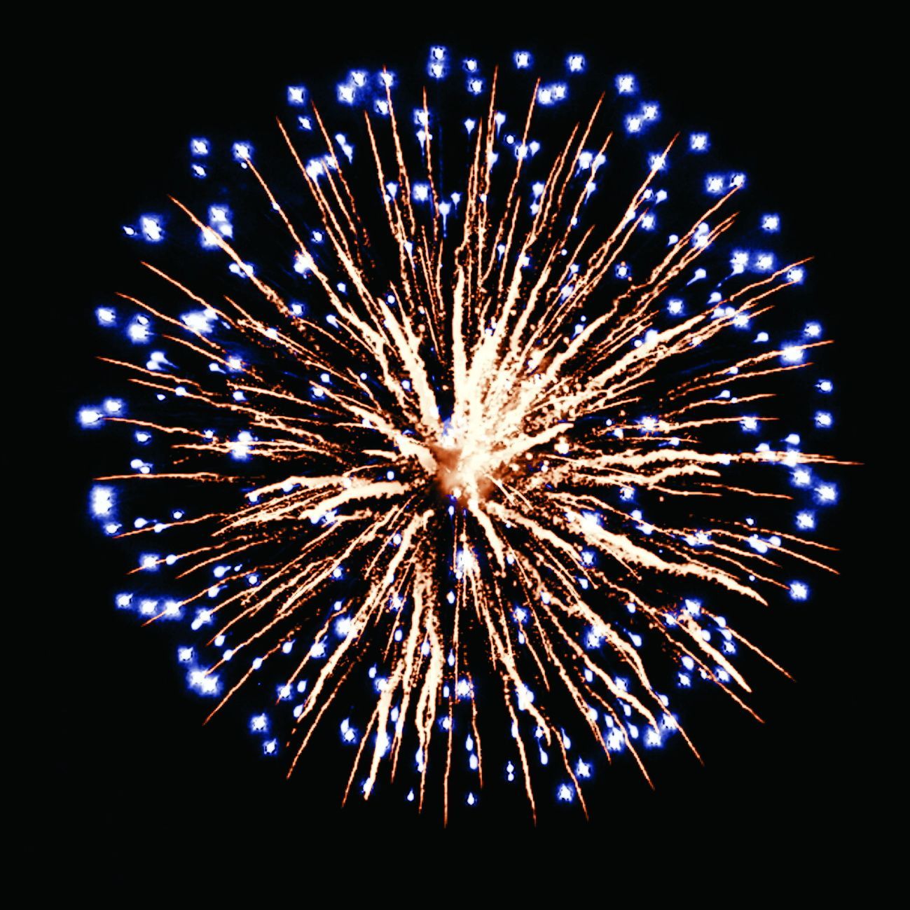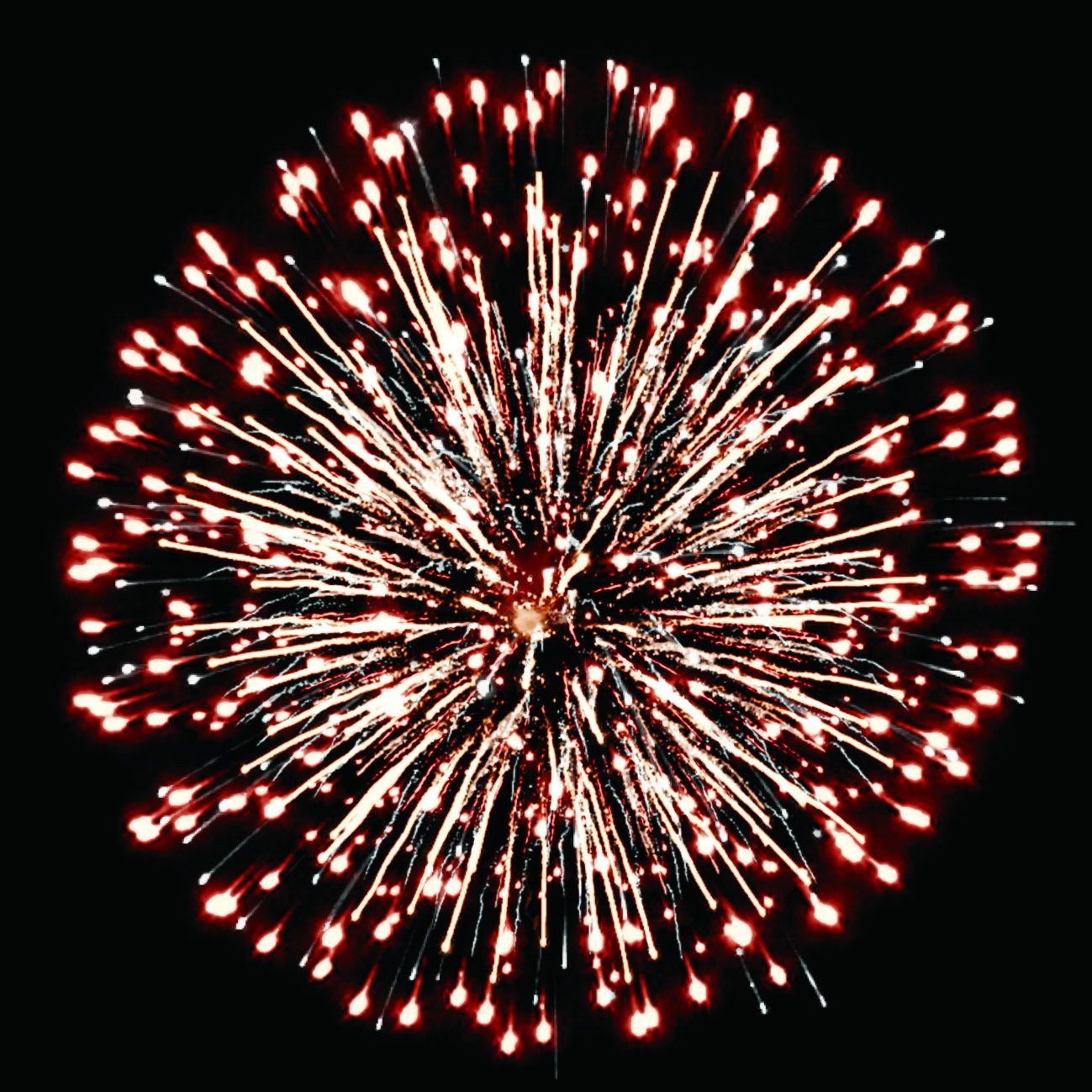 20. Веер. Золотые с серебряными трещащими мерцающими искрами трассы, сферы из золотых форсов и золотых мерцающих огней.