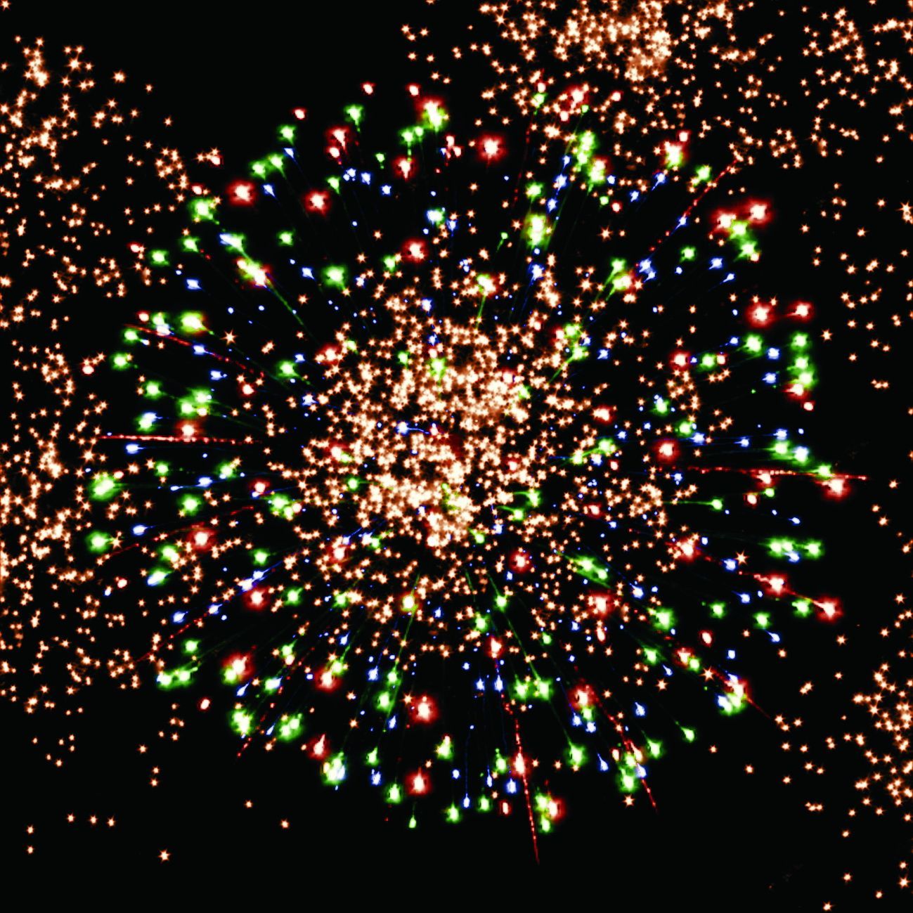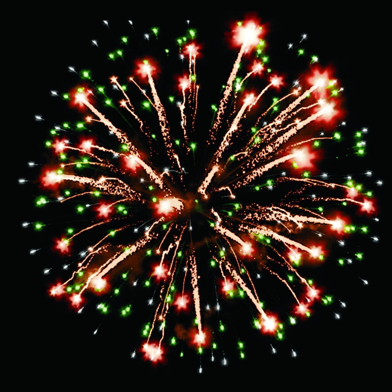 2-3. крупных красных и зелёных, золотых мерцающих огней, множеством золотых трещащих сфер;