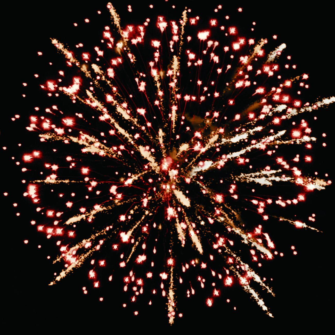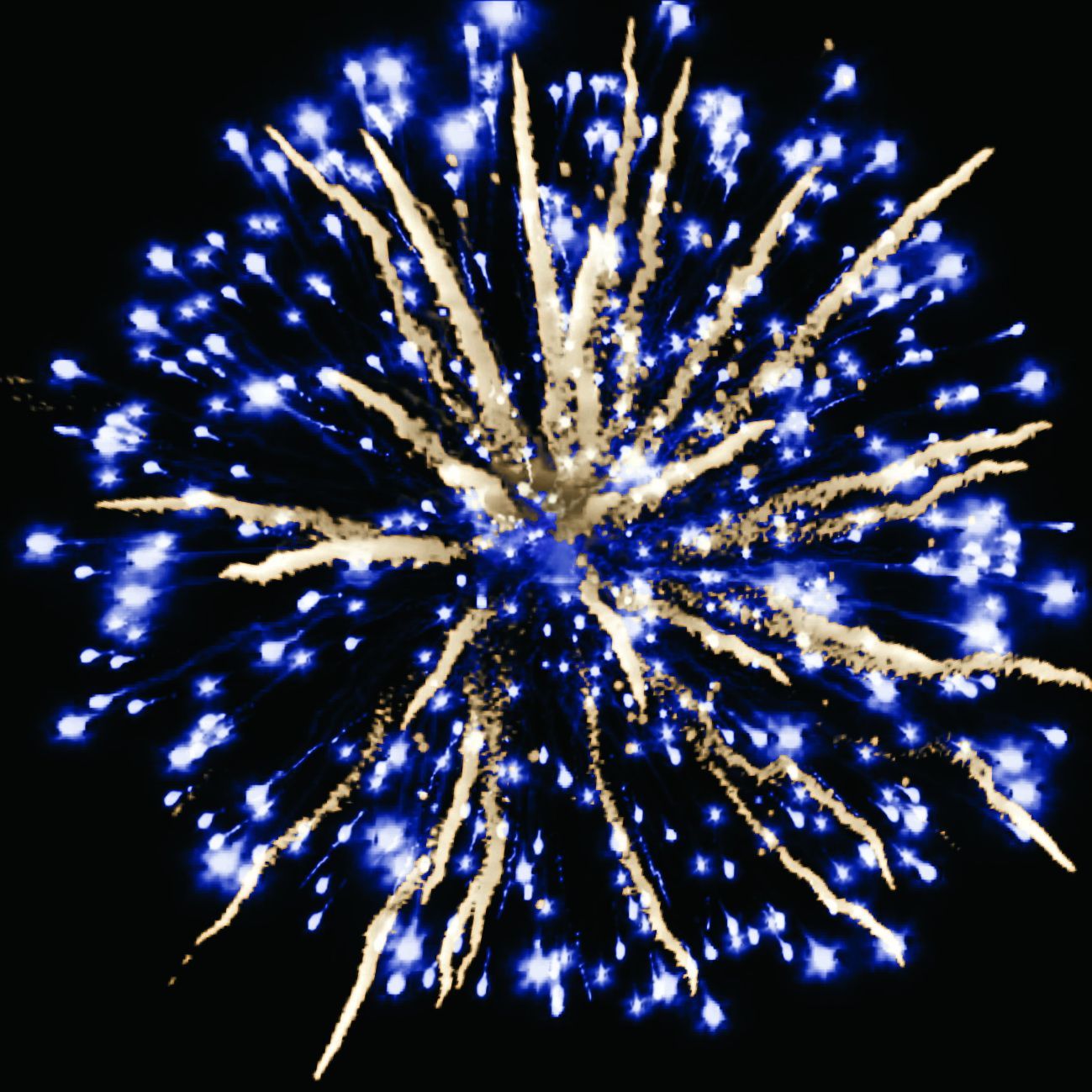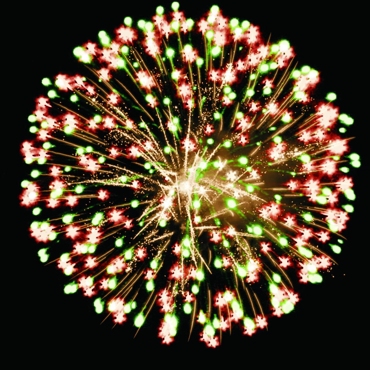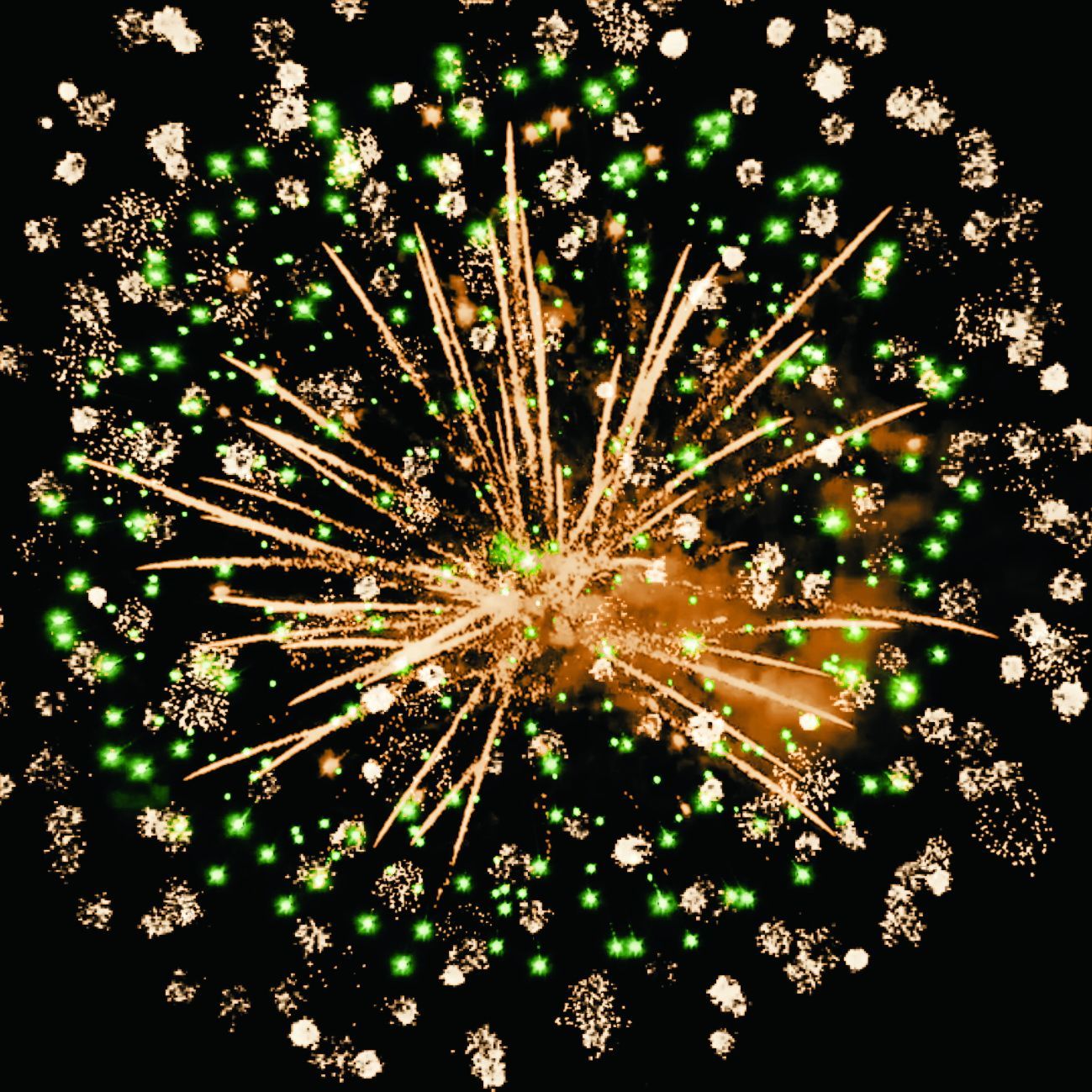 4. золотых форсов с серебряными искрами, крупных красных и зелёных огней;