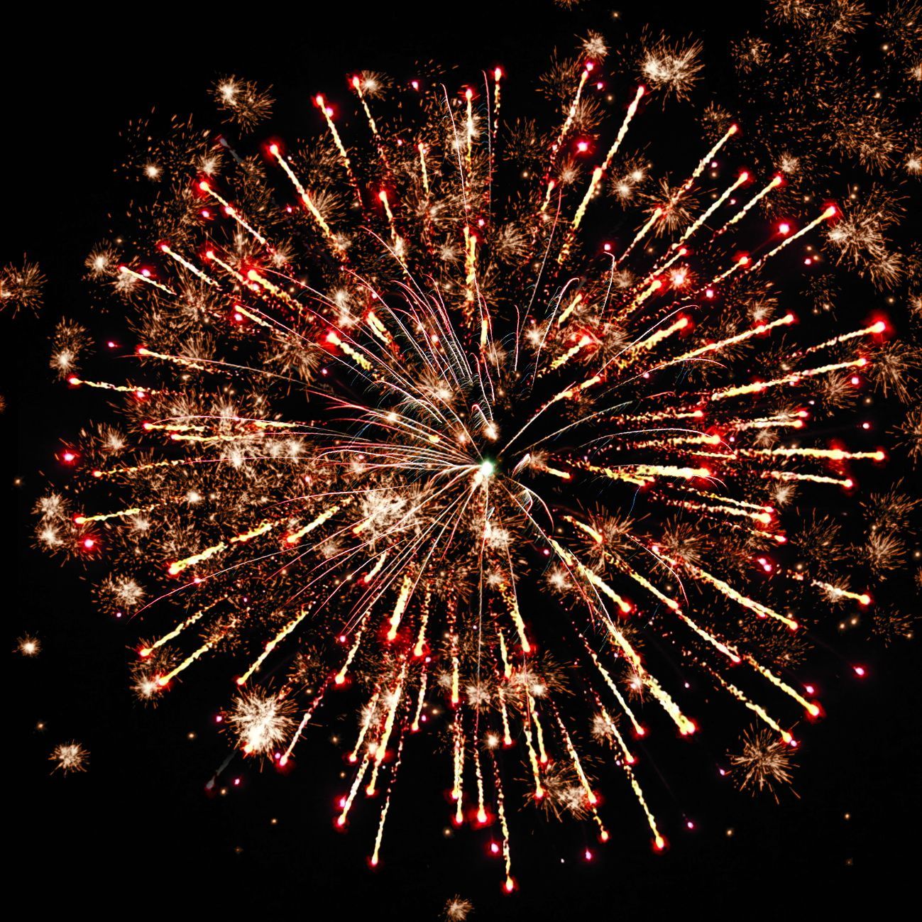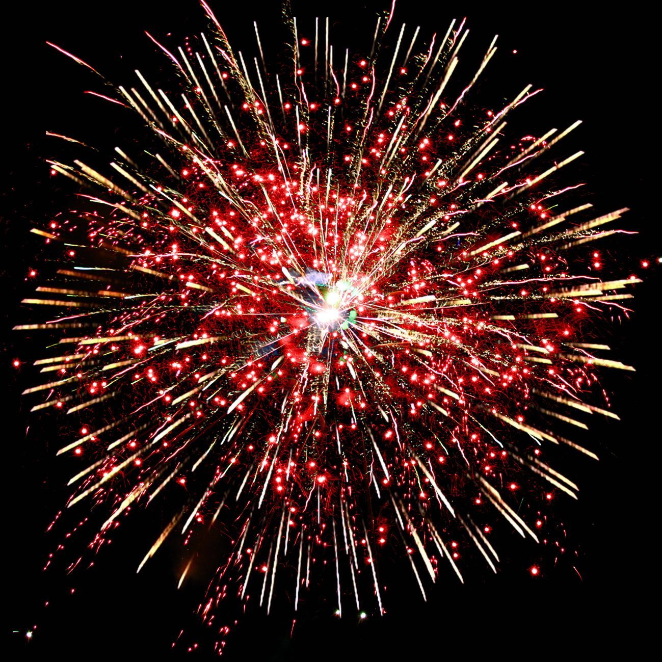 4-6. красных, зелёных, фиолетовых огней и золотых форсов с серебряными трещащими искрами.